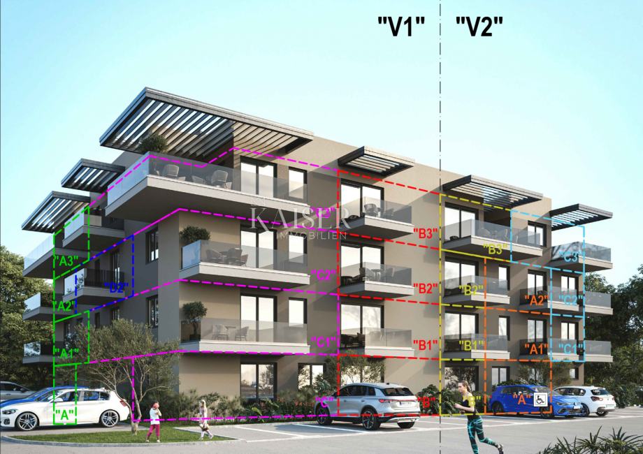 Vabriga - V1- stanovanje B3, 3. nadstropje Kaiser Immobilien prodaja moderno stanovanje v 3. nadstropju v novogradnji s strešno teraso in pogledom na morje, 500 m od morja in centra mesta. To čudovito stanovanje se nahaja na mirni lokaciji 5 km od centra Poreča in 7 km od centra Novigrada. Apartma z uporabno površino 52,86 m2 je sestavljen iz dnevne sobe z odprto kuhinjo in jedilnico z izhodom na pokrito teraso 5,66 m2 s pogledom na morje. Stanovanje ima tudi 1 spalnico in kopalnico. Ta čudovit sodoben apartma ima tudi strešno teraso 39 m2 s čudovitim pogledom na morje in naravo. Stanovanju pripada tudi shramba 1,82 m2 in eno parkirno mesto. Opremljen je s klimatsko napravo v vsaki sobi, v kopalnici pa s talnim gretjem. Stanovanjski objekt je opremljen z vso komunalno infrastrukturo: cesta, mestna kanalizacija, elektrika. oskrba z elektriko in vodo. Stanovanjski objekt ima dvigalo. Odkup na ključ, popolnoma dokončano in vseljivo, brez pohištva. Predviden zaključek del v letu 2023/2024. Stavba se nahaja v mirni soseski v bližini vseh bistvenih vsebin (restavracije, lekarna, pekarna, trgovina itd.) in je idealna priložnost za vse tiste, ki iščete privlačno nepremičnino v bližini morja, primerno za bivanje in dopust kot kot tudi za oddajo v turistične namene. Kupec je oproščen plačila davka na promet nepremičnin.
