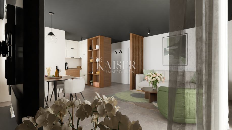 Vabriga - V2- stanovanje C1, 1. nadstropje Kaiser Immobilien prodaja moderno stanovanje v 1. nadstropju v novogradnji, le 500 m od morja in centra mesta. To čudovito stanovanje se nahaja na mirni lokaciji 5 km od centra Poreča in 7 km od centra Novigrada. Stanovanje z uporabno površino 57 m2 je sestavljeno iz dnevne sobe z odprto kuhinjo in jedilnico z izhodom na pokrito teraso 10 m2. Stanovanje ima tudi 1 kopalnico in spalnico z izhodom na 5,32 m2 veliko teraso. Stanovanju pripada tudi shramba 2,40 m2 in eno parkirno mesto. Opremljen je s klimatsko napravo v vsaki sobi, v kopalnici pa s talnim gretjem. Stanovanjski objekt je opremljen z vso komunalno infrastrukturo: cesta, mestna kanalizacija, elektrika. oskrba z elektriko in vodo. Stanovanjski objekt ima dvigalo. Odkup na ključ, popolnoma dokončano in vseljivo, brez pohištva. Predviden zaključek del v letu 2024. Stavba se nahaja v mirni soseski v bližini vseh bistvenih objektov (restavracije, lekarna, pekarna, trgovina itd.) in je idealna priložnost za vse tiste, ki iščejo privlačno nepremičnino v bližini morja, primerno tudi za bivanje in dopust. kot pri oddaji v turistične namene. Kupec je oproščen plačila davka na promet nepremičnin.