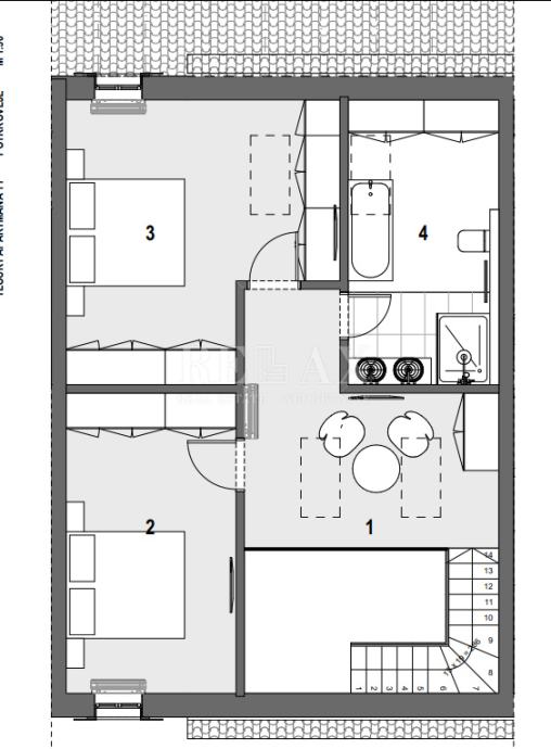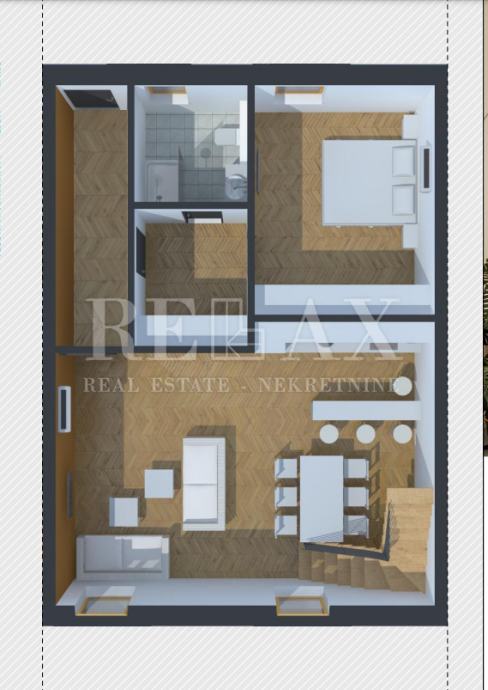 Stanovanje obsega predsobo, spalnico, kopalnico, odprto kuhinjo z jedilnico in dnevno sobo, od koder se po stopnicah povzpnemo v visoko mansardo, kjer pridemo v vežo iz katere gremo v kopalnica in dve spalnici.