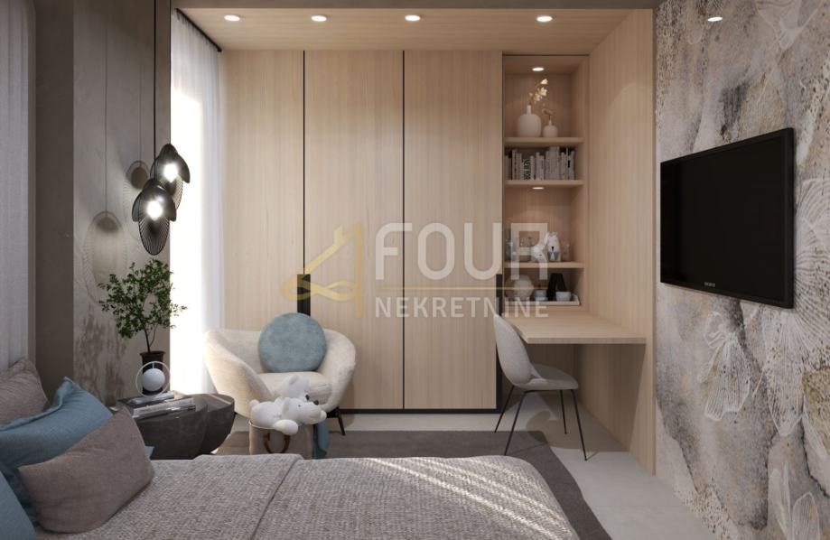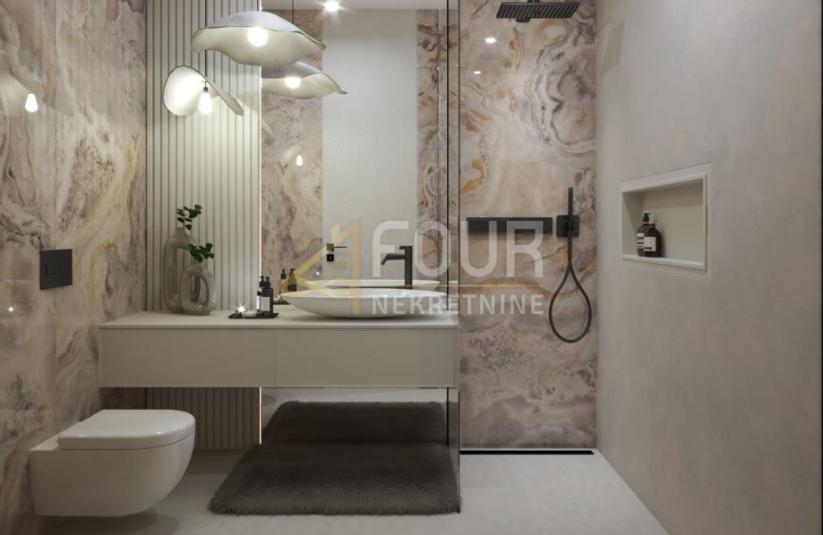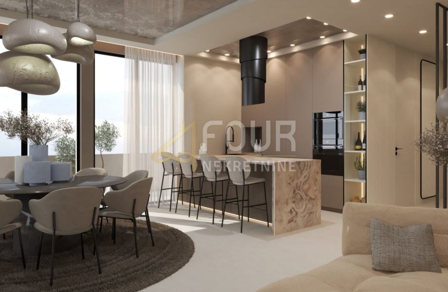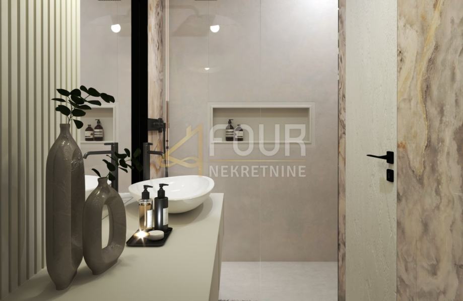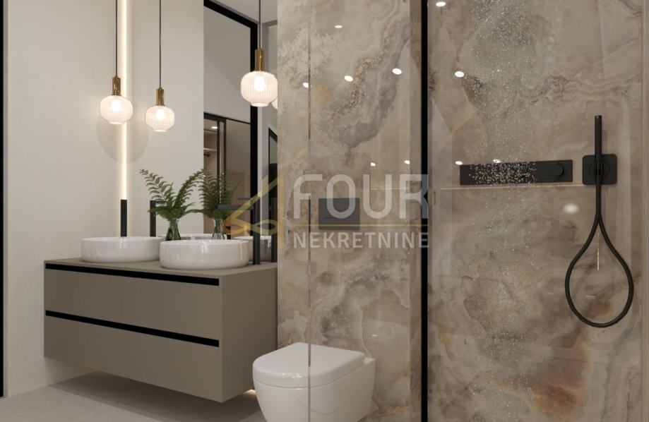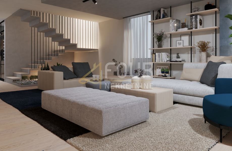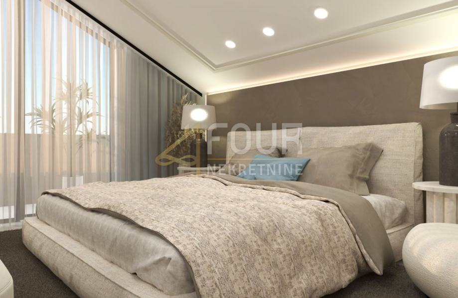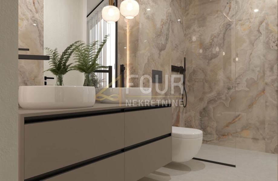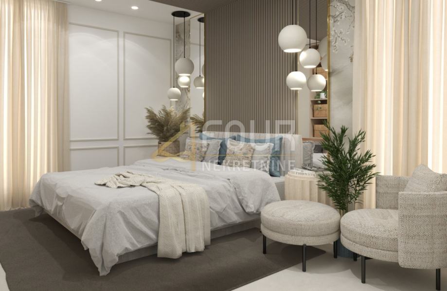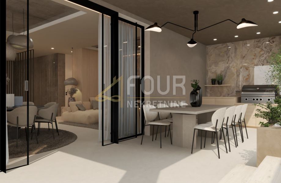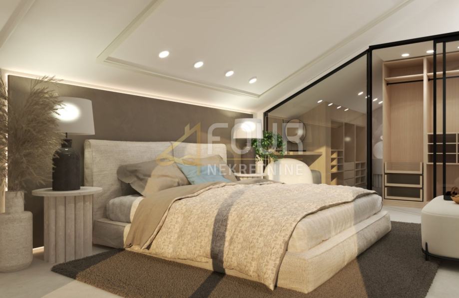 Ta novogradnja, površine 136,81 m², se ponaša z izvrstno razporeditvijo prostorov in visokokakovostno gradnjo. Stan vključuje dnevno sobo s kuhinjo in jedilnico v odprtem prostoru, štiri spalnice, dve kopalnici, stranišče, galerijo, garderobo, prostor za strojarnico, stopnišče ter pokrito in nepokrito teraso s bazenom.