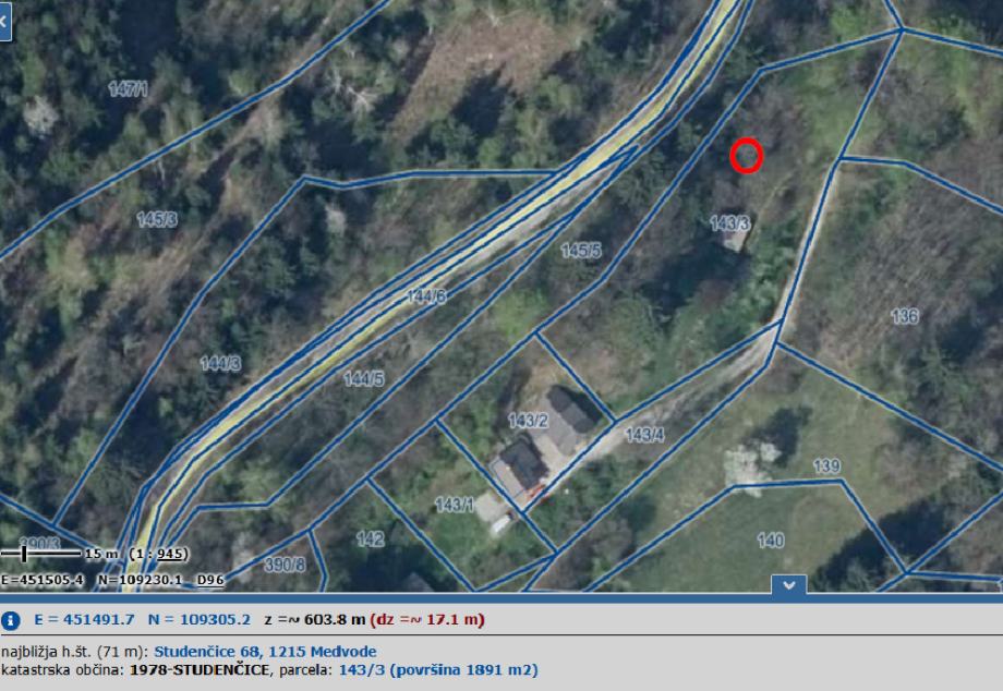 Stavbno zemljišče v vasi Studenčice, 5 km od Medvod na nadmorski višini cca.500-600 m. Do pacele je asfaltirana cesta. Možnost priključitve vodovoda in elektrike. Cena: 75 €/m2. Gre za del parcele 143/3, KO 1978 Studenčice.