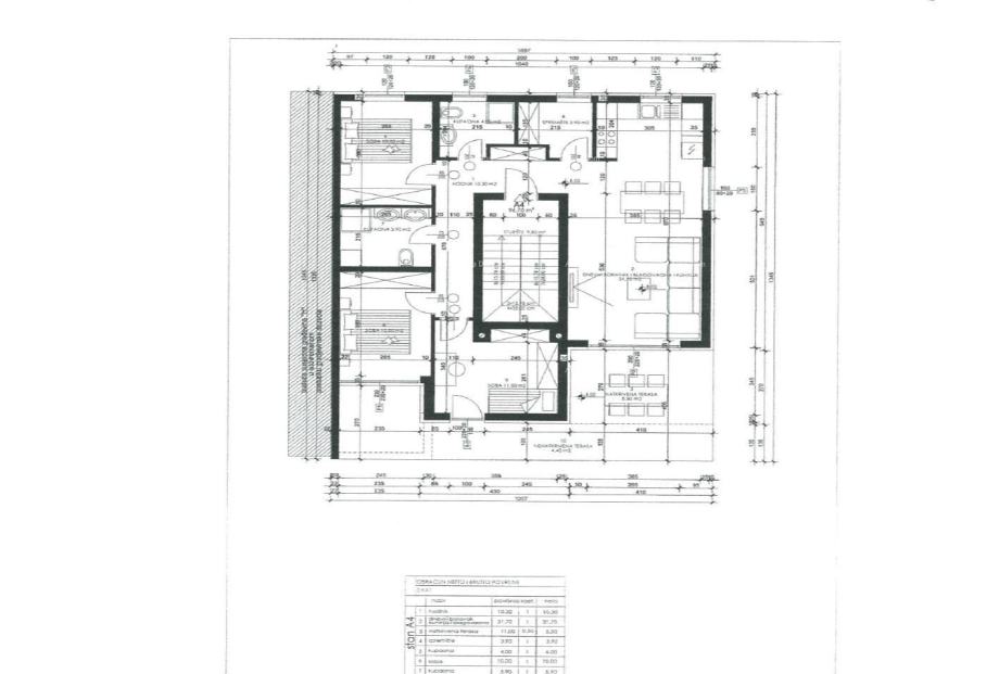 Sestavljen je iz treh spalnic, dveh kopalnic, shrambe, kuhinje, jedilnice in dnevne sobe, iz katere se izhaja na pokrito teraso.