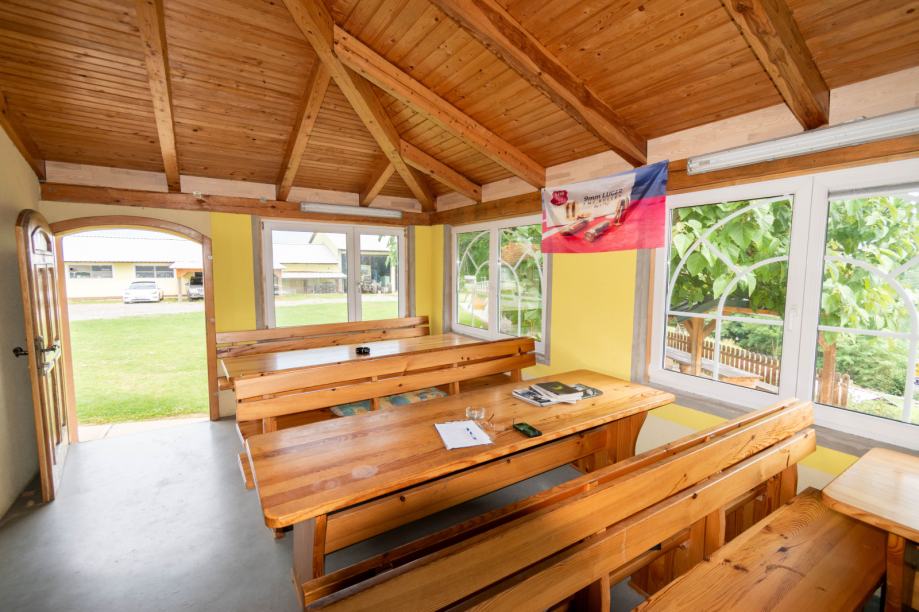 Urejen piknik prostor pod drevesi z naravno senco, zunanjo kuhinjo in dovolj sedišči za večje skupine