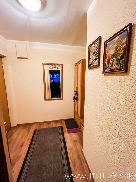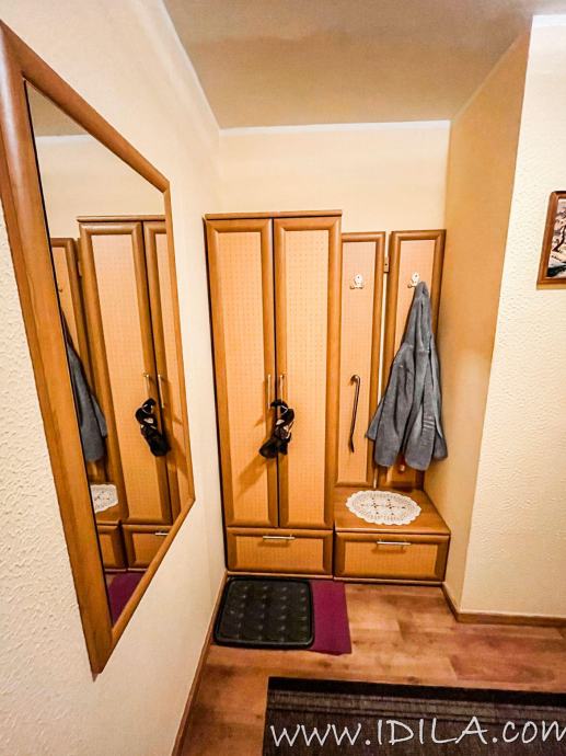 Pri vhodu v stanovanje je manjša predsoba (drsna vrata), ki vodi v dnevni prostor, kjer sta kuhinjska niša z