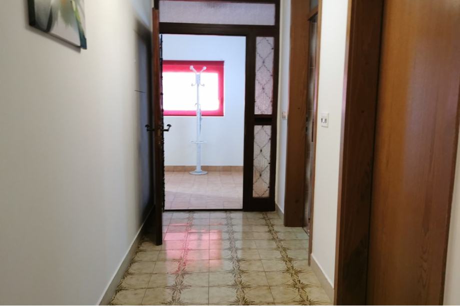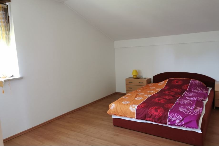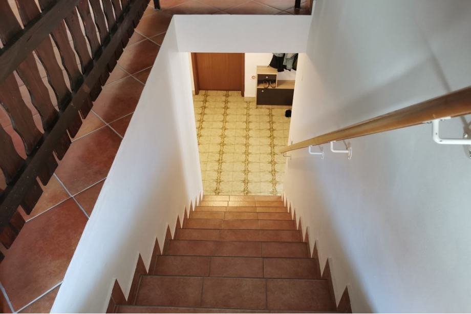 Vhodna vrata v hišo nas povedejo v neke vrste vetrolov, ki vodi naprej skozi vrata na dvorišče ter na desno na hodnik, iz katerega od tod so vsi prostori v pritličju: kopalnica s kadjo in tušem, ločen WC, spalnica, velika dnevna soba z izhodom na nizek balkon ali teraso, s prehodom v jedilnico in kuhinjo ter priročno shrambo. Visoke betonirane stopnice vodijo v nadstropje, kjer je prav tako veji hodnik, tu pa 3 velike spalnice, dve z izhodom na balkon ter še nedokončana kopalnica. Iz gornjega hodnika je prehod na podstrešje. Talne obloge so laminat in keramika, okna lesena (klasična dvoslojna zasteklitev), streha valovitka, fasada (izo 5 cm). Za ogrevanje je samo pripravljena instalacija, predvideno je bilo na olje ali trdo gorivo, ni izvedeno. Kanalizacija je narejena v ulici, hiša ni priključena, elektrika in voda aktivna priključka.