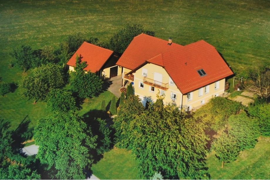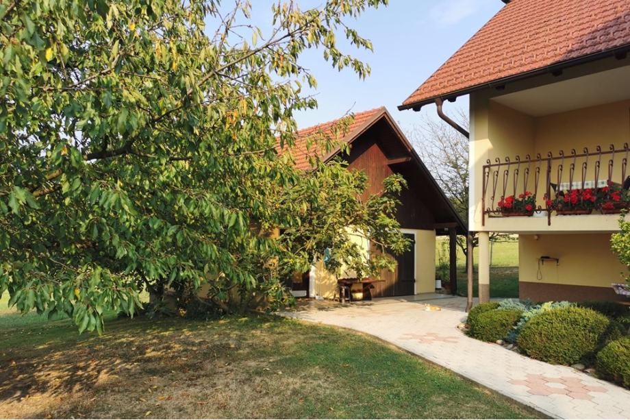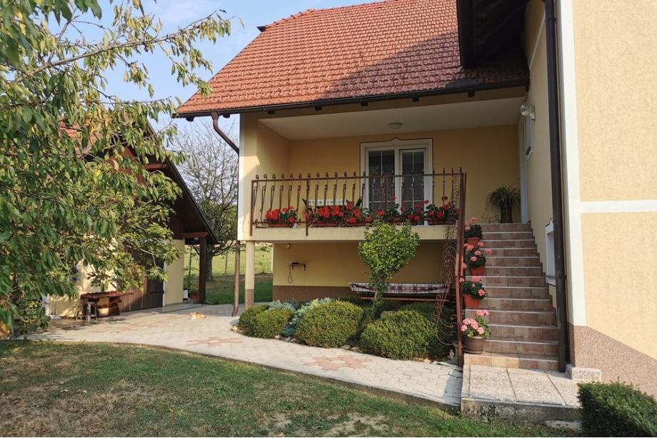 Do vhodnih vrat se v spremstvu bujnih stoječih pelargonij povzpnemo po stopnicah, kjer vstopimo na balkon, vhodna vrata pa so na desno. Skoznje vstopimo v predprostor, ki je hkrati povezovalni hodnik za ostale prostore, ki zavijejo na levo. Na desni je naprej kuhinja z jedilnico in dnevnim prostorom, naprej pa dve spalnici, eš en velik dnevni prostor in kopalnica. Konec hodnika je izhod še na zadnji balkon, kjer se oči spočijejo na zelenih planjavah in nizkih sosednjih gričih. S keramiko obložene zavite stopnice nas popeljejo v gornje nadstropje, kjer so tri spalnice, dve kopalnici, garderobna soba in velika soba za ustvarjanje/druženje. Vsi prostori opremljeni s kvalitetnim sodobnim pohištvom, zidove pa poživljajo umetniška dela lastnice. Prav tako po notranjih stopnicah se spustimo še v klet, kjer imamo pralnico in likalnico s kopalnico, kurilnico, shrambo, delavnico, garažo z električnimi dvižnimi vrati. Iz zunanje strani dostopamo še v ločeno klet za ozimnico. Talne obloge so keramika, parket in laminati, okna PVC (termopan) z roletami, streha opečna (ikaros), fasada izolativna (8-10 cm), dve klimi. Ogrevanje je centralno na olje/drva/pelete, 3-prekatna greznica, elektrika, voda, optika.