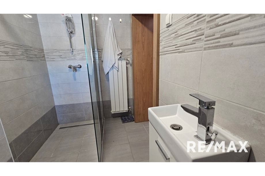 Za vhodom v hišo se nahajata dve 2-sobni stanovanji z dnevno sobo, spalnico, kuhinjo in kopalnico; eno stanovanje je orientirano proti vzhodu drugo prozi zahodu. Zahodno ima tudi zelo veliko teraso, ca 50 m2, ki je pozicionirana nad garažnim prizidkom.