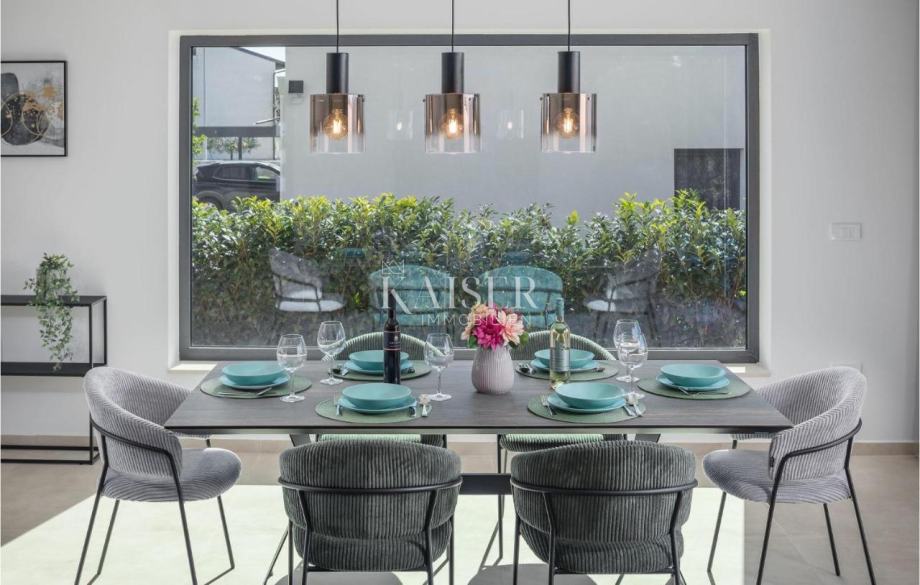 Majhno mesto Novigrad, ki leži na zahodni obali Istre, izstopa po svoji naravni lepoti in bogati kulturni dediščini. Je tudi mesto, ki se ponaša z enim najčistejših morij v tem delu Sredozemlja. Novigradska riviera se razteza od Dajle do ustja reke Mirne in jo krasi razvejana, nizka in dostopna obala s skalnatimi in prodnatimi plažami. Kaiser Immobilien vam predstavlja čudovito moderno vilo z bazenom in velikim dvoriščem z oljkami v bližini Novigrada. Vila ima 3 nadstropja s skupno površino 155 m2, poleg tega pa ima še 30 m3 velik bazen, parkirišče in vrt z oljkami, ki dajejo pristno mediteransko vzdušje. V pritličju se nahaja kuhinja, jedilnica in velika dnevna soba, ki je s stekleno steno povezana s pokrito teraso, teraso za sončenje in bazenom. Stopnice vodijo v klet, kjer se nahaja tehnični prostor (pralnica/kurilnica) in spalnica s kopalnico, ki je po stopnicah povezana s teraso z bazenom in teraso za sončenje. V prvem nadstropju ima vila 2 spalnici s kopalnicami in veliko oken, obrnjenih proti jugu, ki zagotavljajo veliko dnevne svetlobe. Vse spalnice imajo zakonsko posteljo. Vila je moderno opremljena in v celoti opremljena z vsemi potrebnimi gospodinjskimi aparati. Hlajenje je s klimatsko napravo, talno ogrevanje pa je s toplotno črpalko. Prostorno parkirišče omogoča parkiranje 4 vozil. Ta čudovita hiša se nahaja v mirni vasi, le 2,5 km od morja in centra mesta. Vila in prostoren vrt velikosti 710 m2 sta idealen kraj za vsakdanje življenje in počitnice družin z otroki. V bližini: Izposoja koles: 2500 m Označena pohodniška pot, 0-5km: 500 m Gorskokolesarska steza, 0-5km: 500 m Kolesarska steza 0-5km: 500 m Tekaška steza - Trim steza: 2000 m Fitnes center: 2000 m Trgovina s hrano za hišne ljubljenčke: 2000 m Plaža, kjer so hišni ljubljenčki dobrodošli: 2000 m Veterinar: 12000 m Oddaljenost od letališča: PUY: 70000 m Oddaljenost od soseda: 100 m Oddaljenost od trgovine: 2000 m Oddaljenost od restavracije: 500 m Oddaljenost od mesta: 2000 m (Novigrad) Oddaljenost od obale/plaže: 2500 m (Prodnata plaža) Provizija agencije za kupca znaša 3% + DDV. Provizija krije vse storitve, povezane z nakupom, in se izplača le v primeru nakupa nepremičnine, ob sklenitvi prvega pravnega dejanja. Če želite, da ta moderna vila z bazenom in čudovitim vrtom postane vaš novi dom, nas kontaktirajte. Damir Mlacović e-pošta: damir@kaiser-immobilien.hr tel: +385-98-339-933