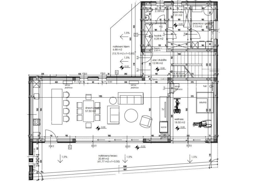 V pritličju objekta je pokrita veranda, hodnik, WC, pralnica, kurilnica/shramba, wellness, dnevna soba, stopniščni del in pokrita terasa.