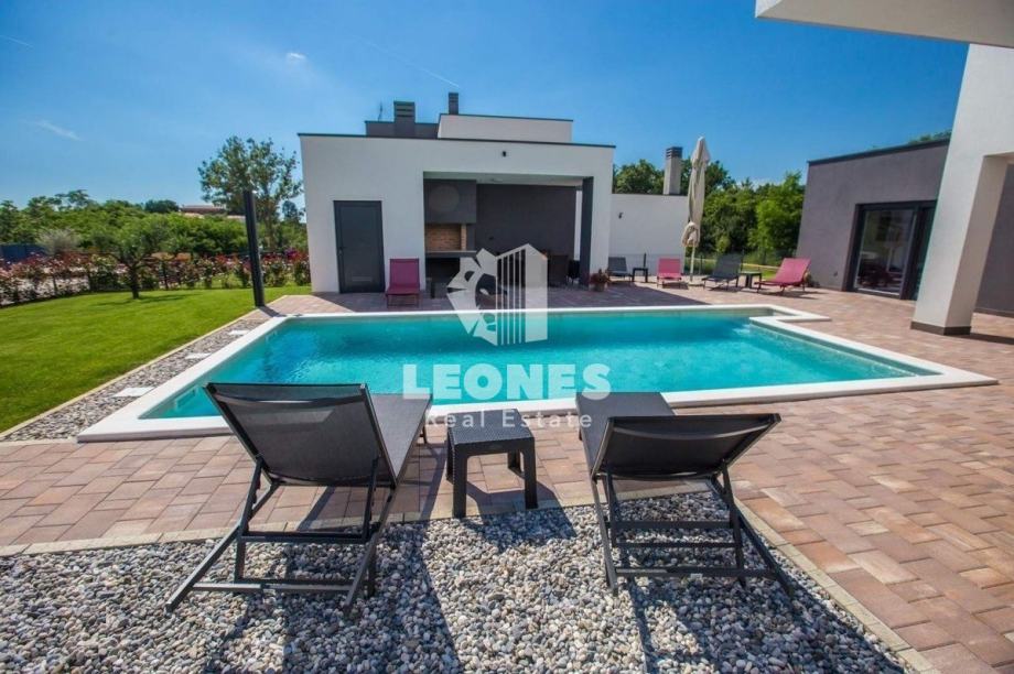 Prodaja se vila z bazenom v okolici Poreča. Površina vile je 215 m2, medtem ko je površina zemljišča 766 m2. Pritličje obsega hodnik, prostorno dnevno sobo s kuhinjo in jedilnico, spalnico s kopalnico in izhodom na pokrito teraso. Dnevna soba ima kamin in številne steklene stene, ki dajejo vili dodatno svetlobo. V prvem nadstropju vile so tri spalnice z lastno kopalnico in izhodom na teraso. Na dvorišču je velik bazen z letno kuhinjo, shrambo in straniščem.