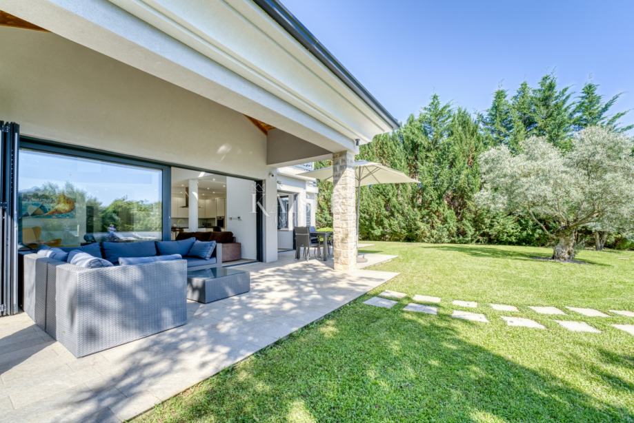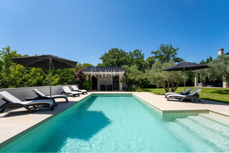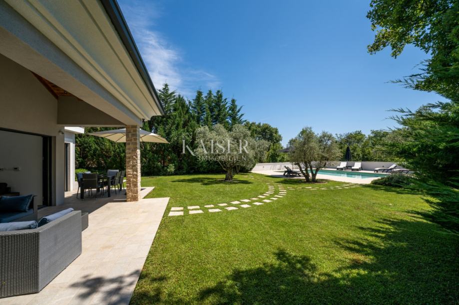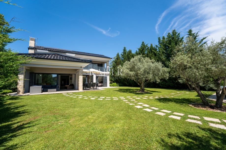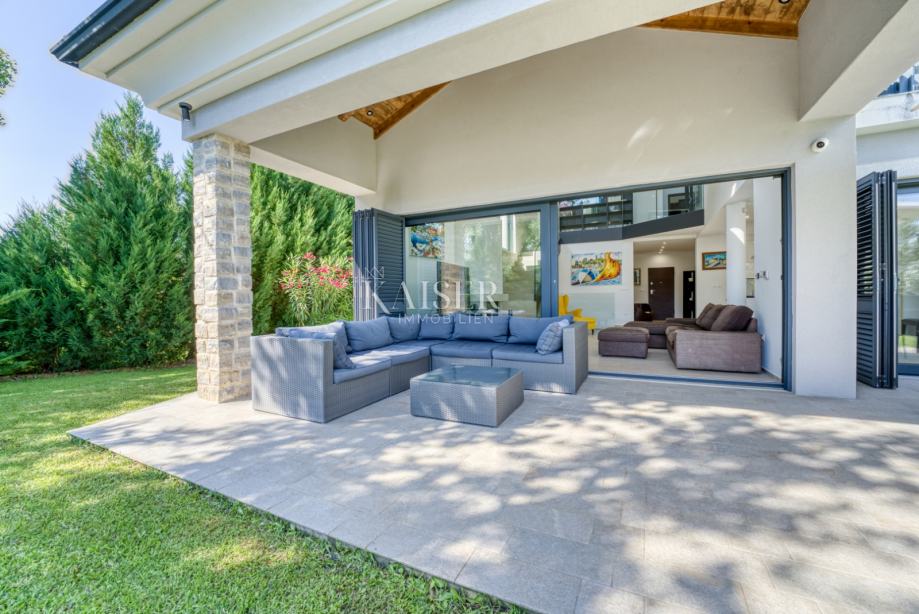 SAMO V NAŠI PONUDBI! Če iščete mir, ki ga ni mogoče opisati z besedami, žvrgolenje ptic zjutraj, oranžne poletne večere, pesem čričkov in omamni vonj zelenja v osrčju sredozemskega otoka, je ta nepremičnina prava izbira za vas. Kaiser immobilien ekskluzivno posreduje pri prodaji te izjemno luksuzne nepremičnine, ki se nahaja v čarobni notranjosti otoka Krk na Krasu, najvišje ležečem naselju na otoku. Te vile je nemogoče opisati z besedami, najbolje jo je doživeti od blizu. Vila že na prvi pogled daje vtis varne, mirne in sodobne družinske hiše, ki uporablja najboljše sodobne tehnologije in tradicionalne načine gradnje, kar vse skupaj rezultira v popolni kombinaciji skladnega dizajna, nizke porabe energije in luksuznih detajlov. Ob samem pristopu k objektu, v senci že oblikovanih dreves, je prostorno parkirišče. Ograja, ki se odpira na daljavo, skriva prostorno ograjeno dvorišče v sprednjem delu vrta, kjer je mediteranski vrt, drevored in delujoč čudovit kamnit vodnjak. Vila se nahaja na ograjeni parceli 1.000m2 in je sestavljena iz treh etaž, pritličja, prvega nadstropja in kleti, s skupno bivalno površino 290m2. Nahaja se v harmoničnem in mirnem okolju, hkrati pa v bližini vseh pomembnih vsebin. Za masivnimi vhodnimi vrati vstopimo v predsobo v pritličju, ki je sestavljena iz "open space" dnevne sobe, ki obsega dnevno sobo, kuhinjo in jedilnico. Dnevno sobo krasi visok strop, ki pripomore k zračnosti in izredno dobri osvetlitvi z naravno svetlobo ter čudovit kamin Palazzetti, ki pripomore k vzdušju in po potrebi tudi greje v zimskih mesecih. Iz dnevne sobe je skozi masivno aluminijasto stekleno steno izhod na prostorno pokrito teraso s pogledom na skladno urejen vrt. V pritličju je še spalnica za goste z lastno kopalnico, shramba in WC. Ena od posebnosti te nepremičnine je tudi prostorna garaža velikosti 30 m2 z garažnimi vrati Hörmann, ki je povezana z vežo v pritličju za vstop v hišo direktno iz vozila. V prvem nadstropju so tri spalnice z lastnimi kopalnicami, do katerih vodi stopnišče iz pritličja. Glavna spalnica in kopalnica imata izhod na teraso s čudovitim pogledom na morje in gozdnate predele osrednjega dela otoka. Ta soba ima tudi prostorno garderobno omaro. Preostali dve spalnici imata skupen izhod na teraso in francoski balkon. Vila ima tudi klet, kjer je družabni prostor z delno steklenim stropom ter pralnica in strojnica. Pri gradnji in opremi so bili uporabljeni vrhunski materiali, kot so Porotherm blok 35 cm v kombinaciji z 18 cm stenske izolacije in 24 cm strešne izolacije, plinsko talno ogrevanje Viesmann z wi-fi regulacijo, solarni kolektorji in kamin priključen na centralno ogrevanje, alu stavbno pohištvo in polkna, Velux okna in senčila z avtomatskim zapiranjem v primeru dežja in sončne energije, masivni kamniti okenski okvirji, kopalnice Villeroy&Boch. Vse sobe so klimatizirane. Varnostni sistem je sestavljen iz 6 kamer, video nadzora in alarma, ki je neposredno povezan z izvajalcem varnostnih storitev. Internetna povezava poteka preko optičnega kabla. Na prostornem in brezhibno urejenem vrtu se nahaja travnata površina, ki vodi do ogrevanega bazena dimenzij 9,5x5m, obloženega z vrhunsko keramiko. Na voljo je tudi prostor za sončenje, tuš in nadzemna strojnica z robotskim čistilcem bazenov. Vrtnarstvo je skrbno izbrano in skrbno negovano, izpostavljamo neokrnjeno zelenico, na kateri rastejo štiristoletne oljke, ki lastnikom iz leta v leto ponujajo možnost, da s količino svojih plodov izdelajo lastno ekstra deviško oljčno olje. Druga posebnost te nepremičnine, ki jo dela zaželeno, je zagotovo rezervoar za pitno vodo s prostornino 150 m3, ki v kombinaciji z bakrenimi strešnimi žlebovi predstavlja dodaten vir celoletne oskrbe s pitno vodo za vse člane gospodinjstva in goste. Cisterna za pitno vodo v kombinaciji s tehnologijo in materiali, uporabljenimi pri izdelavi, prispeva k izjemno nizkim režijskim in vzdrževalnim stroškom. Nepremičnina se prodaja opremljena in opremljena. Provizija agencije za kupca znaša 3% + DDV in se plača v primeru nakupa nepremičnine ob sklenitvi prvega pravnega posla. Trgovina: 100m Restavracije: 2000m Plaža: 4000m Otroško igrišče: 100m Letališče: 15km Kras se nahaja v notranjosti otoka, skoraj v njegovem geografskem središču, na križišču cest, ki vodijo iz Dobrinja proti Krku ali Malinski. Kars je najvišje ležeče naselje na otoku Krk, ki leži 266 metrov nad morjem. V neposredni bližini je najvišji vrh tega dela otoka, Sv. Juraj, 311 m, prvič se omenja leta 1230 v stari glagolski listini. Toponomist in romanopisec Petar Skok izpeljuje ime Kras iz predlatinske, morda ilirske besede "carsus", iz katere se je razvila hrvaška beseda kras, krs.
