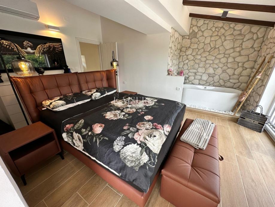 Kaiser immobilien posreduje pri prodaji elegantne vile v rustikalno-mediteranskem slogu, ki se nahaja na lepi lokaciji. Objekt s skupno površino 328 m2, z lepo urejenim vrtom 870 m2, se nahaja na mirni lokaciji v bližini vseh vsebin in le 2,5 km od morja in prvih plaž v zračni črti. V pritličju je bivalni prostor odprtega tipa, ki obsega dnevno sobo in jedilnico, kuhinjo, eno spalnico s kopalnico in WC za goste. Iz kuhinje in dnevne sobe je izhod na prostorno pokrito teraso velikosti 42 m2. Spodaj je skrbno urejen vrt s kaminom na drva. V zgornjem nadstropju so tri prostorne spalnice z lastnimi kopalnicami in zasebnimi balkoni, iz katerih je čudovit odprt pogled na morje in okoliško naravo. Ogrevanje/hlajenje je urejeno preko klime (pametno upravljanje preko Wi-Fi), po celotni hiši je nameščeno talno ogrevanje (pametno upravljanje preko Wi-Fi), v jedilnici pa je kamin na pelete, ki daje posebno vzdušje v prostoru. hladnih dneh (pametno upravljanje preko Wi-Fi). Vila ima tudi 3 solarne panele s 400L bojlerjem za ogrevanje sanitarne vode, opremljena pa je s pametnim video nadzorom in alarmnim sistemom. Na lepo urejenem in ograjenem vrtu se nahaja otroški park z animacijo za najmlajše, žar, ogrevan bazen dimenzij 8 x 4m, sistem za ogrevanje vode s toplotno črpalko (wi-fi smart). Sredozemske rastline in travo na vrtu vzdržuje pametni namakalni sistem. Dodatna lastnost te nepremičnine je garaža na daljinsko odpiranje in pralnica, skupne površine 54 m2. Dvorišče je ograjeno z ograjo, dostop pa preko drsnih vrat na daljinsko vodenje. ID KODA 105-220 Provizija agencije za kupca znaša 3% + DDV in se plača v primeru nakupa nepremičnine, ob sklenitvi prvega pravnega posla.