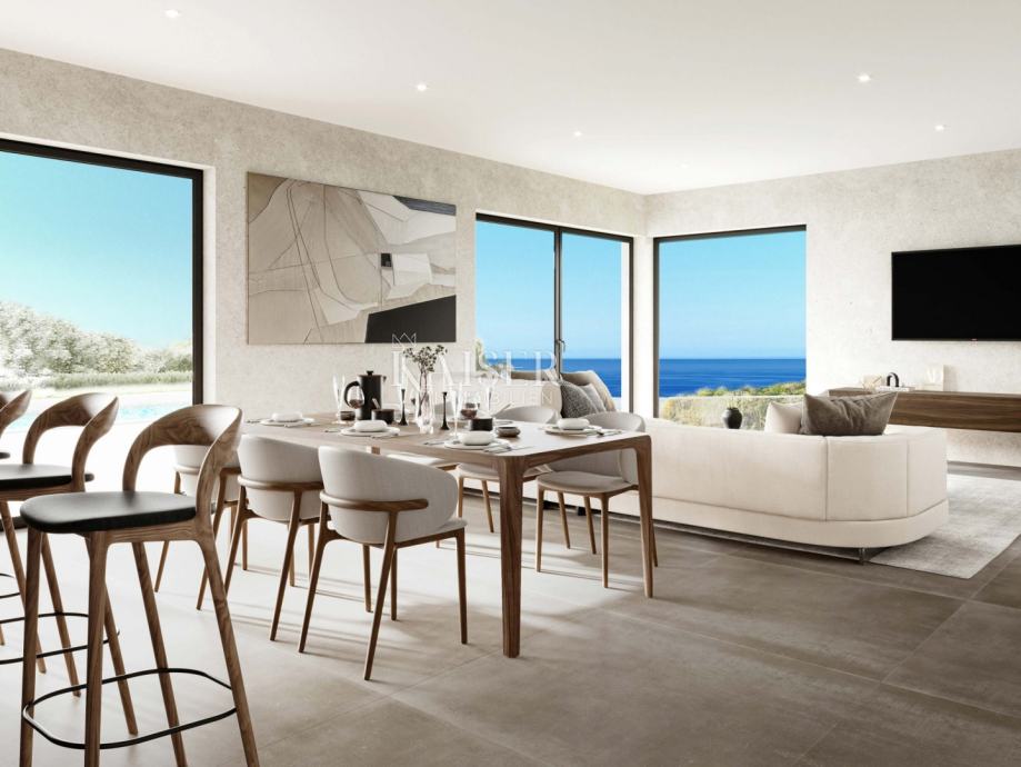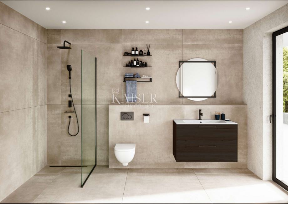 Kaiser Immobilien ponuja v prodajo luksuzno vilo v okolici Poreča v novogradnji, v bližini vseh pomembnih objektov (trgovine, restavracije, parki), 2,7 km od morja in 9 km od mesta Poreč. Vila s skupno površino 230 m2 se razteza v treh etažah, pritličju, prvem in drugem nadstropju. Pritličje obsega vhod, prostorno dnevno sobo z odprto kuhinjo in jedilnico, wellness s savno in tušem, pralnico, stranišče in shrambo. Iz dnevne sobe je direkten dostop na pokrito teraso 42 m2 z bazenom 32 m2 in sončno teraso. V prvem nadstropju so štiri spalnice z lastno kopalnico in čudovito pokrito teraso 36 m2 s pogledom na morje in pokrajino. Na vrhu je strešna terasa 58 m2, ki je delno pokrita. Vrt je ograjen, v osrednjem delu je bazen velikosti 32 m2, s čudovitim prostorom za sončenje in kaminom. V celotni hiši je urejeno talno ogrevanje, ki ga izvaja električna toplotna črpalka Mitsubishi, hlajenje pa je izvedeno s klimatskimi napravami v vseh prostorih. Nepremičnina je zgrajena iz kvalitetnih gradbenih materialov z opeko 25 cm + 10 cm toplotne izolacije, alu stavbnim pohištvom antracit barve s troslojnim steklom in polkni. Vila ima tudi alarm in video nadzor ter 2 parkirni mesti. Odkup po sistemu "ključ v roke", v celoti dokončano in vseljivo jeseni 2023, brez pohištva. Zaradi svoje privlačne lokacije je ta edinstvena nepremičnina odlična izbira za počitnice, bivanje ali najem v turistične namene.