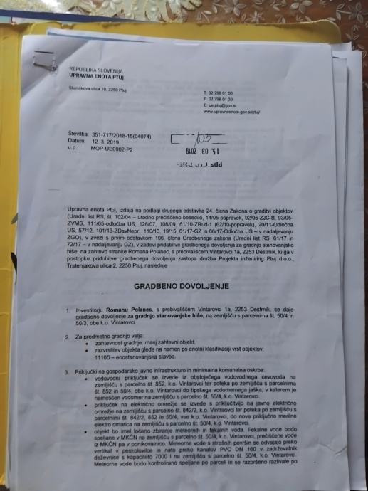 Prodajamo gradbeno parcelo z vso dokumentacijo na parceli sta voda, elektrika, ter optika. Z projektom katerega se lahko spremeni po želji. Parcela je v bližini Ptuja, smer Janežovci - Jiršovci - Lenart - Maribor, ima gradbeno dovoljenje, soglasje od komunale Ptuj za vodo, optika je od T2. Slike projekta so navedene