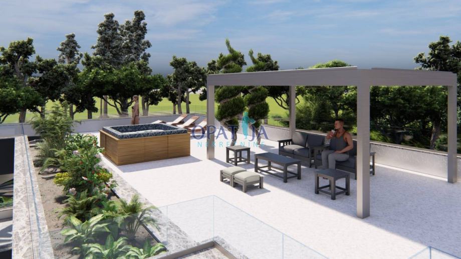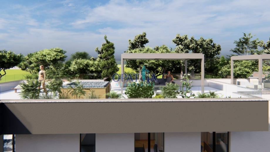 Pravi vrhunec je prostorna strešna terasa z osupljivim pogledom na morje, opremljena z jacuzzijem in pergolo – popoln kraj za sprostitev in uživanje v mediteranskem soncu.