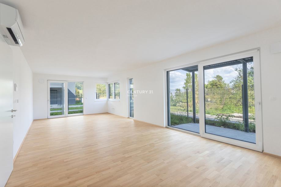 Stanovanje odlikuje odličen tloris. Dve spalnici imata svoj predprostor (za garderobo ali npr. igralni prostor za otroke), dve kopalnici (ena s kopalno kadjo in druga s tušem), prostorna dnevna soba z jedilnico in izhodom na atrij.