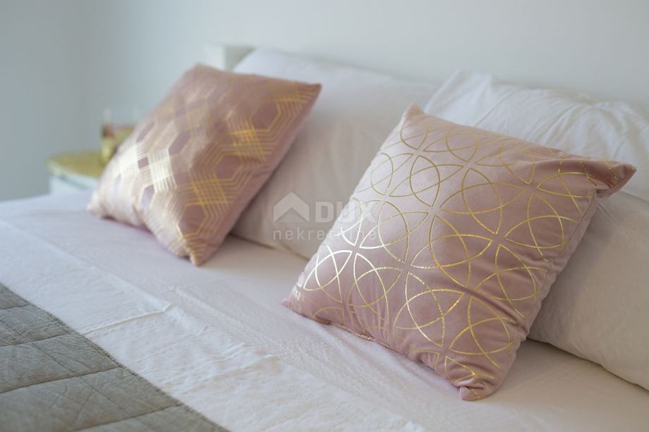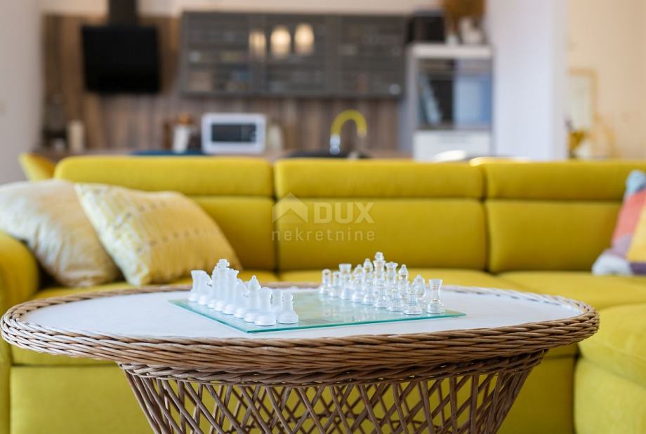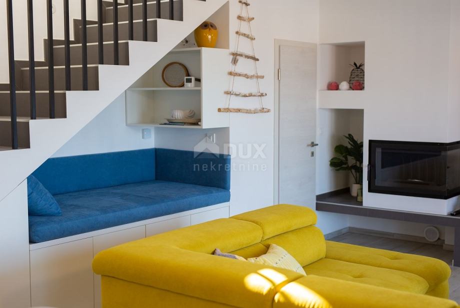 Otok Krk, Vrbnik - moderna vila s panoramskim pogledom na morje. Ta čudovita vila dvojček površine 127 m2 z bazenom jemlje dih z nepozabnim pogledom na morje in mesto Vrbnik. Stavba je novogradnja iz leta 2020 in ima tri etaže. V kleti so strojnica, kuhinja, WC in konoba, v klet pa se pripelje po zunanjem stopnišču. V pritličju je spalnica z lastno kopalnico in izhodom na zunanjo teraso, WC, kuhinja z jedilnico in dnevna soba, ki se odpira na pokrito teraso z urejenim vrtom in ogrevanim bazenom. Na tej terasi lahko uživate v pomirjujočem in posebnem pogledu na Kvarner in modro morje. V nadstropje pridemo po notranjem stopnišču, ki ima hodnik, kopalnico in tri spalnice z izhodom na balkon s čudovitim razgledom. Ena od sob ima lastno kopalnico. Objekt ima dve parkirni mesti. Objekt je opremljen s kvalitetnimi materiali, ima talno gretje na toplotno črpalko in vsi prostori so klimatizirani.