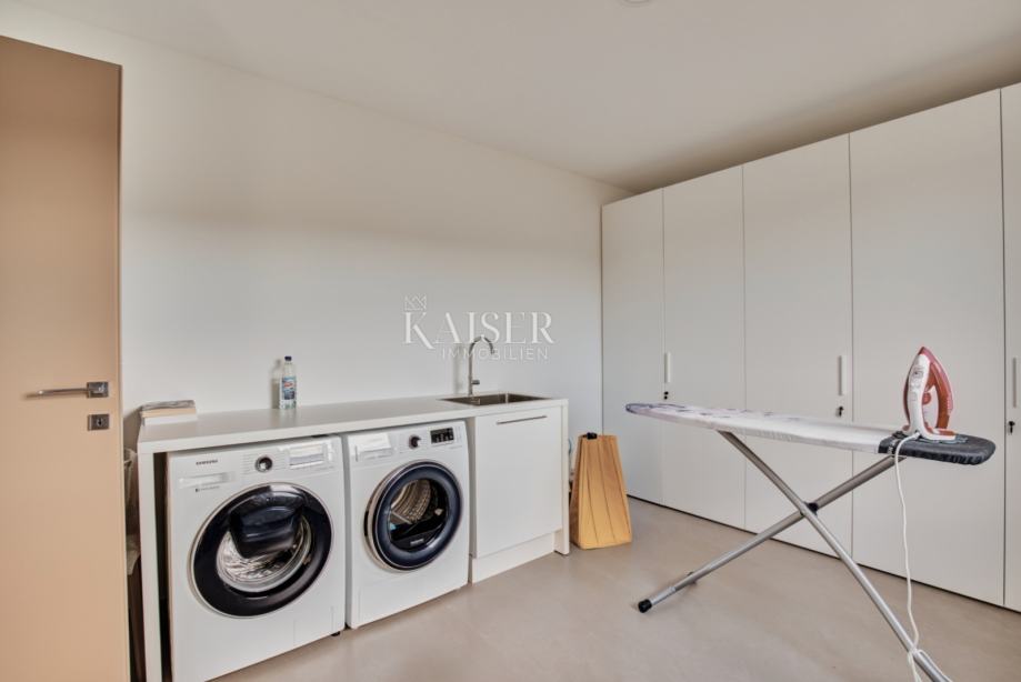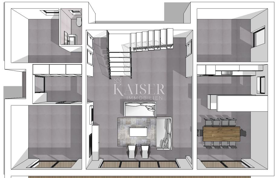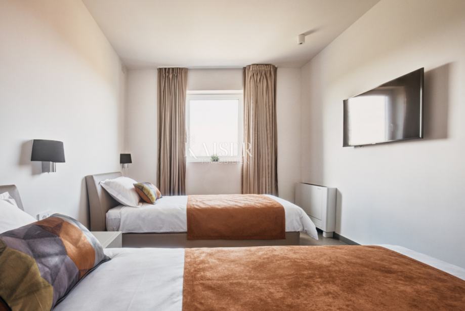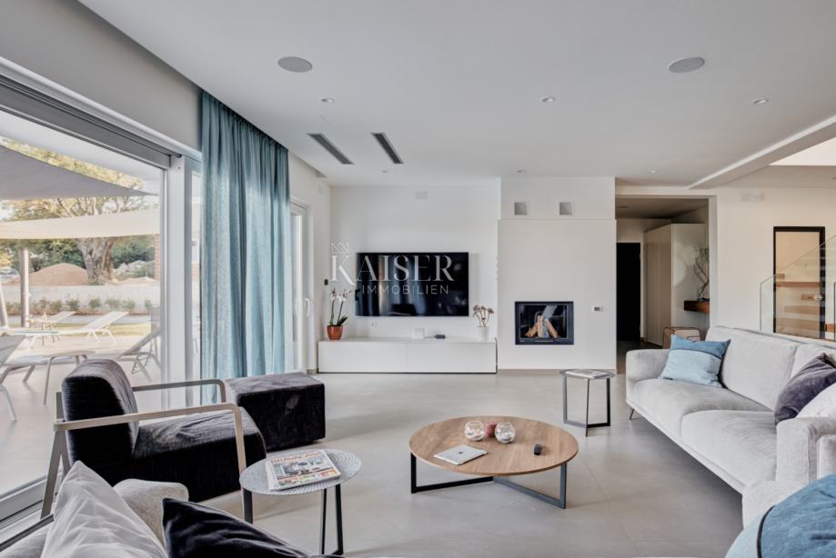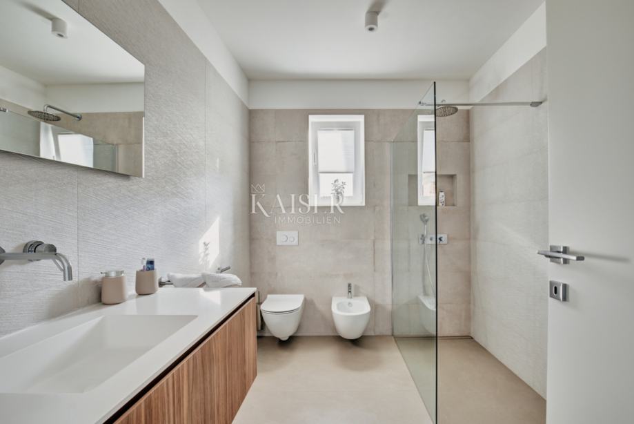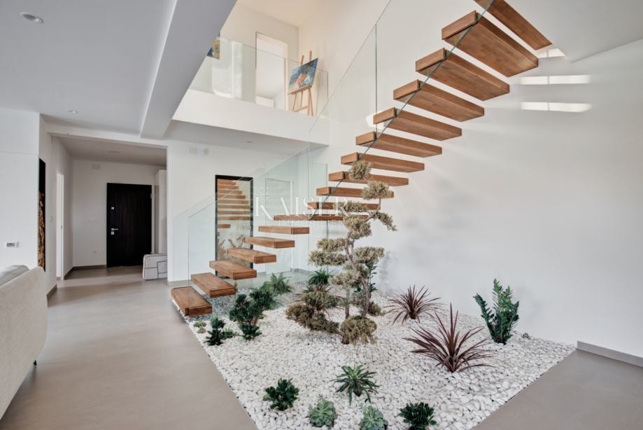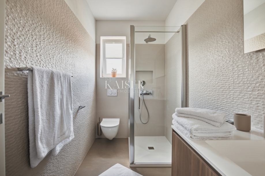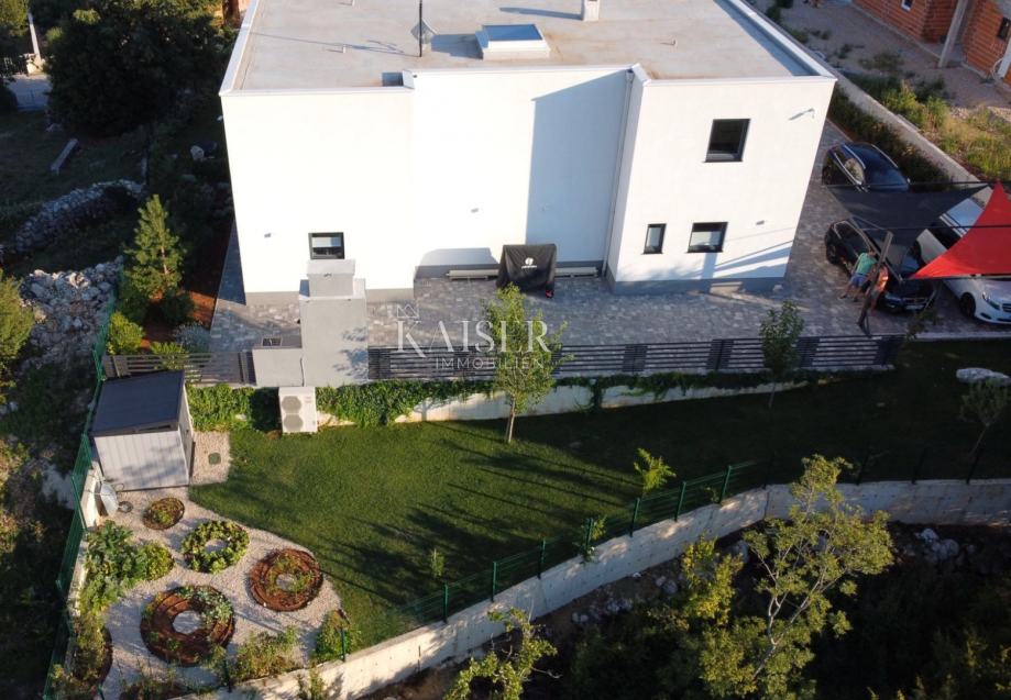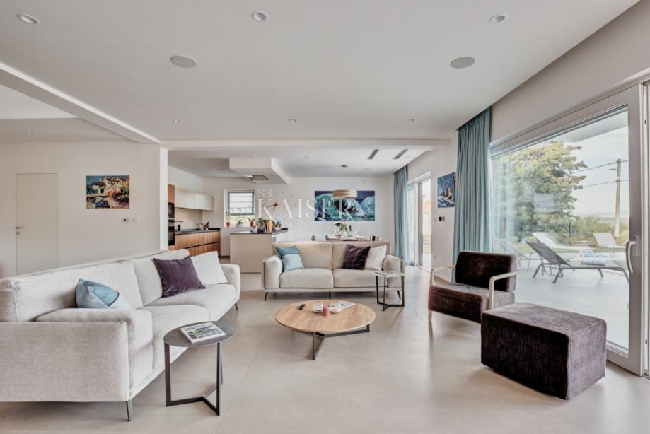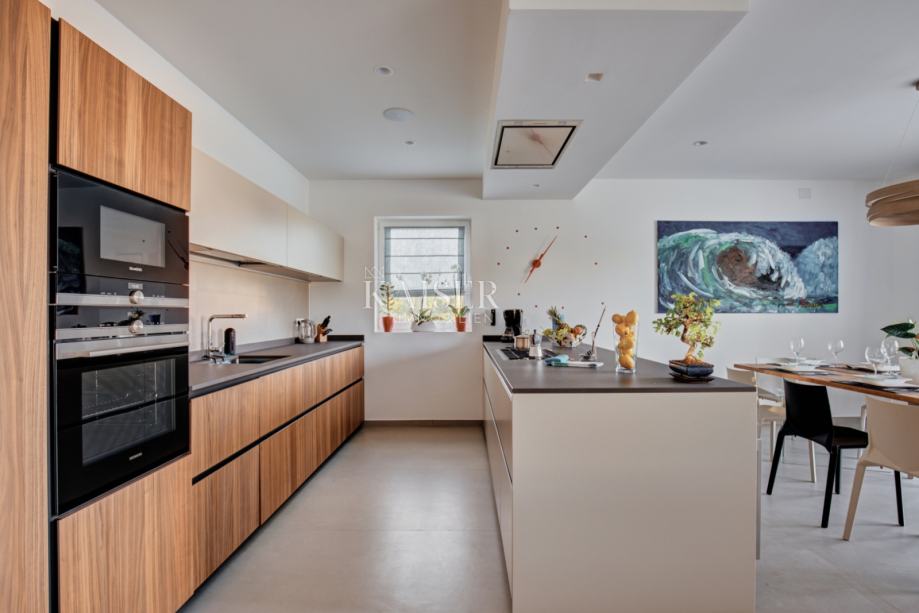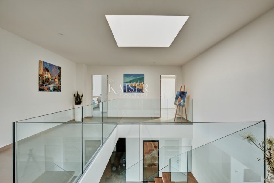 Kaiser Immobilien daje na trg čudovito vilo na zelo mirnem delu otoka Krka v vasi Vrh, le 5 km od centra Krka. Vila se nahaja na zemljišču velikosti 1244 m2, nudi 293 m2 bivalne površine in se razprostira na dveh etažah. V pritličju je hodnik, dnevna soba, moderna kuhinja in jedilnica, WC in čaroben zimski vrt. V pritličju je še shramba, kurilnica, igralnica in fitnes ter finska savna Hafro Geronim za 3-4 osebe s kromoterapijo. Prvo nadstropje je dostopno po notranjih stopnicah in obsega hodnik, utility in 4 spalnice, vsaka s svojo kopalnico (3 spalnice imajo vsaka svojo ložo). Vila ima tudi DVC video nadzor s 4 kamerami in alarmni sistem znamke Ajax. Nepremičnina se ogreva in hladi s sistemom ventilatorskih tuljav in toplotno črpalko Mitsubishi Ecodan za talno ogrevanje in pripravo sanitarne vode. Vila je zgrajena iz ytong elementov z zunanjimi zidovi debeline 40 cm in ravno streho s 25 cm izolacije. Alu koža mizarstvo ima troslojno steklo. Parkirišče za dve vozili, bazen 40 m2 s kvalitetno folijo in sistemom za čiščenje vode Ecosalt (elektroliza). Terasa ob bazenu, kuhinja, dnevna soba in savna imajo večsobno ozvočenje. Na vrtu je nameščeno avtomatsko namakanje Rainbird, na voljo pa je tudi robotska kosilnica Husquarna. Nepremičnina ima lasten rezervoar za vodo s prostornino 58 m3.