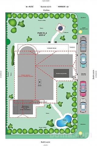 Kompletna parcela je ograjena in s treh strani obdana s posebnimi cipresami, vrste SMARAGD (cca. 120 cimpres), ki nikoli ne porjavijo.