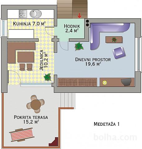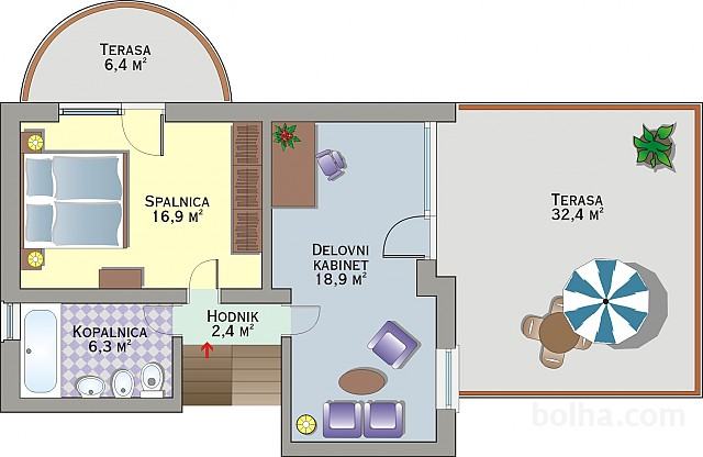 Prva medetaža obsega hodnik, dnevno sobo, kuhinjo, jedilni kot in pokrito teraso z žarom. Druga medetaža obsega hodnik, kopalnico s sanitarijami, spalnico z izhodom na balkon, velik delovni kabinet in pokrito teraso veliko cca. 29 m2.