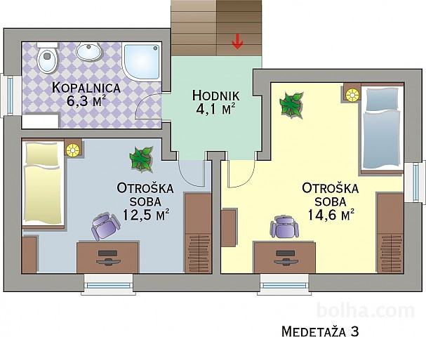 Tretja medetaža obsega hodnik, kopalnico s sanitarijami in tuš kabino ter dve otroški sobi.