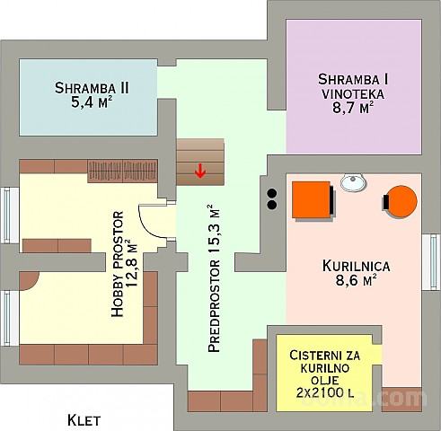 Klet obsega hodnik, kurilnico, prostor za cisterno, savno, vinoteko, kletni prostor in dve sobi.
