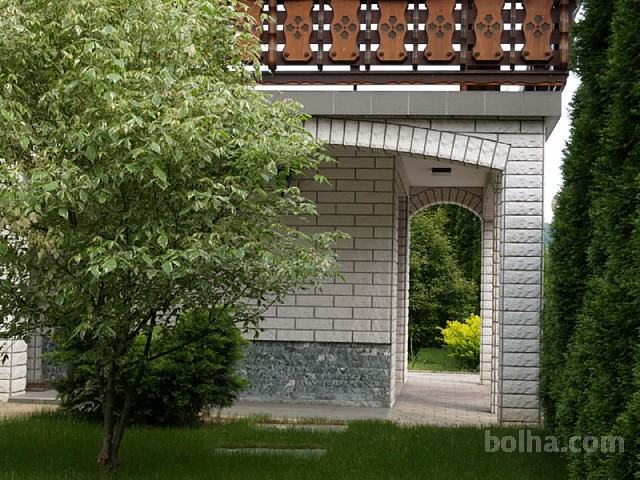 Izolacijska fasada je iz: 2-cm termo-ometa + 6-cm heraklit plošče + 2-cm belega umetnega kamna. Specialni fasadni cokel je iz lomljenega granita.