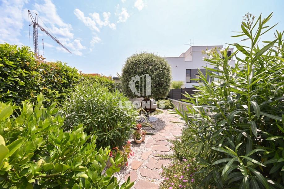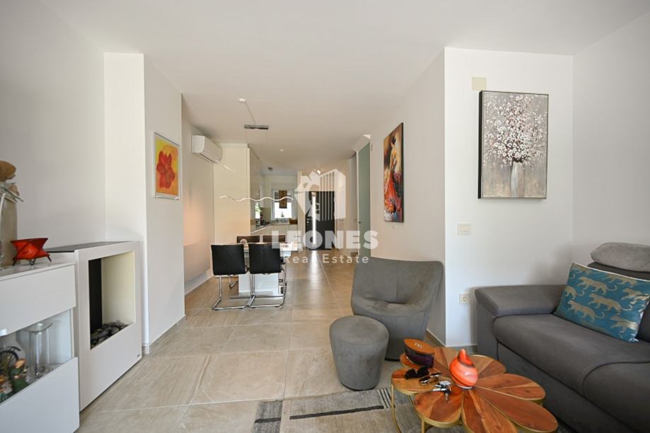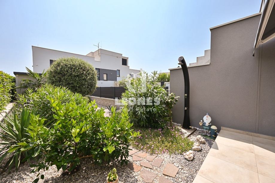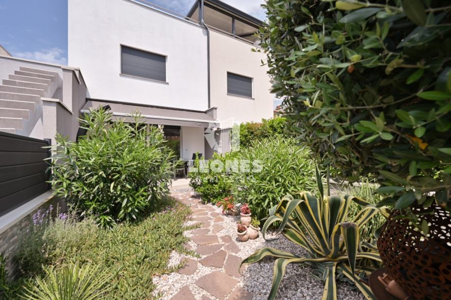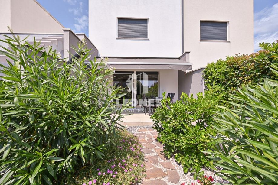 Hiša je sestavljena iz predsobe, stranišča, shrambe, lepe in dobro opremljene kuhinje z jedilnico in dnevne sobe z dostopom do pokrite terase, ki je povezana z lepo urejenim dvoriščem, zasajenim z različnimi mediteranskimi rastlinami.