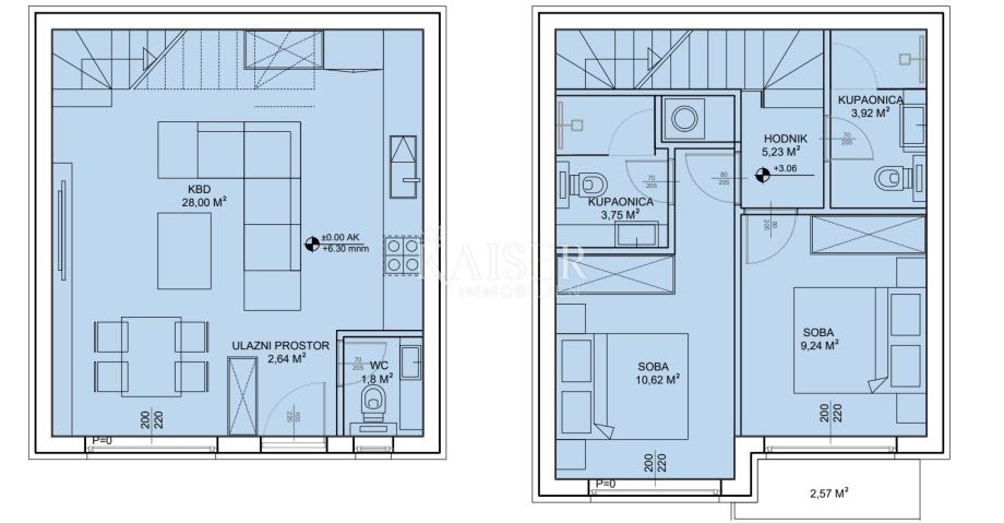 V srcu mirnega dalmatinskega mesta Sveti Petar na Moru, le 200 metrov od obale, se nahaja moderno in funkcionalno dvonadstropno stanovanje velikosti 76,02 m² z lastnim vrtom. Ta nepremičnina je idealno ravnovesje med udobjem, kakovostjo in bližino morja. Ne glede na to, ali gre za družinsko hišo, vikend oddih ali naložbo v turistični najem, to stanovanje ponuja vse, kar potrebujete za udobno in brezskrbno življenje. Posebna pozornost je namenjena kakovosti gradnje in opreme. Visokokakovostna keramika in talno gretje zagotavljata toplino in prijetno bivanje skozi vse leto, kakovostno PVC stavbno pohištvo pa zagotavlja toplotno in zvočno izolacijo, zaščito prostora pred hrupom in zunanjimi vplivi ter zagotavlja maksimalno zasebnost. Začetek gradnje marca 2025. , zaključek gradnje je april 2026. Nepremičnina ima vso potrebno dokumentacijo in urejeno lastništvo. Stanovanje obsega pritličje in nadstropje, ki sta povezana z notranjimi stopnicami. Pritličje – 34,10 m² Vhodna površina – 2,64 m² Dnevna soba + jedilnica + kuhinja – prostoren in svetel odprt prostor 28,00 m² WC – 1,80 m² Stopnišče – 1,66 m², povezuje pritličje in nadstropje Prvo nadstropje – 32,76 m² Hodnik – 5,23 m², povezuje vse prostore v prvem nadstropju Soba 1 – 10,62 m² Soba 2 – 9,24 m² Kopalnica 1 – 3,75 m² Kopalnica 2 – 3,92 m² Dodatna površina: Loža – 2,57 m² (preračun 1,93 m²) Pokrita terasa – 3,55 m² (preračun 1,78 m²) Vrt – 6,21 m² (preračun 0,62 m). ²) Parkirni prostor – 14,25 m² (obračunano 2,85 m²) Sveti Petar na Moru se nahaja med Zadrom in Biograd na Moru in ponuja mirno in prijetno okolje z odličnimi prometnimi povezavami. Zadar – 19 km Biograd na Moru – 12 km Avtocesta (A1, izvoz Zadar II) – 15 km Nacionalni park Kornati – dostopen z ladjo iz Biograda Nacionalni park Krka – 60 km Split – 130 km Zagreb – 290 km Za več informacij in organizacijo izleta nas kontaktirajte! Telefon: 00385992510230 E-pošta: marijana.papic@kaiser-immobilien.hr