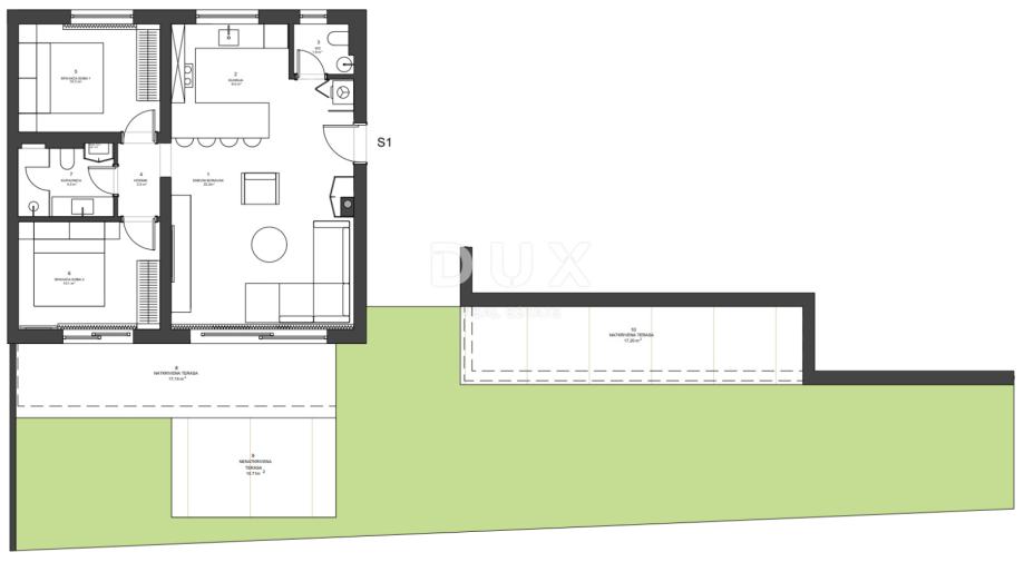 V mirnem in očarljivem mestecu Zaton, le 45 metrov od plaže, se nahaja nova moderna stavba z dvema vhodoma in dvema dvigaloma, ki skriva deset ekskluzivnih apartmajev. Vsak od njih je bil skrbno zasnovan za maksimalno udobje in uživanje - apartmaji v pritličju so obogateni z zasebnimi vrtovi, apartmaji v srednjih nadstropjih imajo prostorne terase, penthousi pa ponujajo strešne oaze z instalacijami za letne kuhinje in jacuzzije, idealne za sproščena večerna druženja ob sončnem zahodu. Vsi apartmaji so opremljeni s klimatsko napravo v vsaki sobi, penthousi pa imajo dodatno talno ogrevanje po celotni notranjosti. Apartma A1 z neto površino 107,87 m2 združuje funkcionalnost in eleganco. Razporeditev vključuje dve spalnici, kopalnico, dodatno stranišče, kuhinjo in prostorno dnevno sobo. Odlikujejo ga tri terase - dve pokriti in ena odprta -, ki odlično povezujejo notranje in zunanje prostore. Stanovanju pripadata tudi dve parkirni mesti in shramba, oprema pa vključuje električne rolete, varnostna vrata in video domofon. Kupci imajo tudi možnost prevzema popolnoma opremljene notranjosti, kar jim omogoča vselitev brez dodatnih skrbi. Posebna ugodnost – kupec je oproščen plačila davka na nepremičnine, ker je prodajalec pravna oseba. Zaton je znan po dolgih prodnatih plažah, kristalno čistem morju in mirnem vzdušju, ki združuje tradicionalno dalmatinsko vzdušje s sodobnimi ugodnostmi. V neposredni bližini se nahaja letovišče s številnimi ugodnostmi – restavracijami, kavarnami, športnimi igrišči in wellness programi, zaradi česar je ta kraj idealen tako za počitnice kot za življenje skozi vse leto. Le deset minut vožnje stran je Zadar, mesto bogato z zgodovino in kulturo, svetovno znano po rimskih forumih, romanskih cerkvah, Morskih orglah in Pozdravu soncu. Če iščete kombinacijo razkošja, udobja in mediteranskega načina življenja, nas kontaktirajte za več informacij in za dogovor o ogledu.