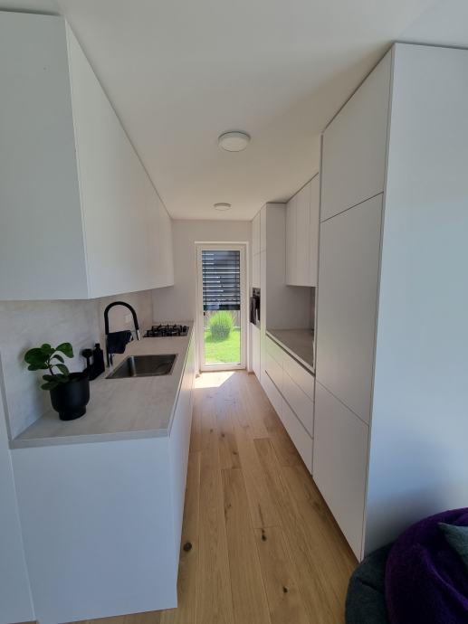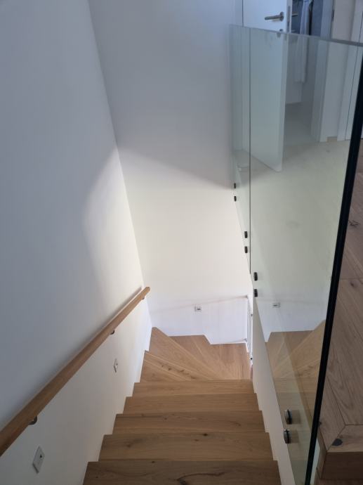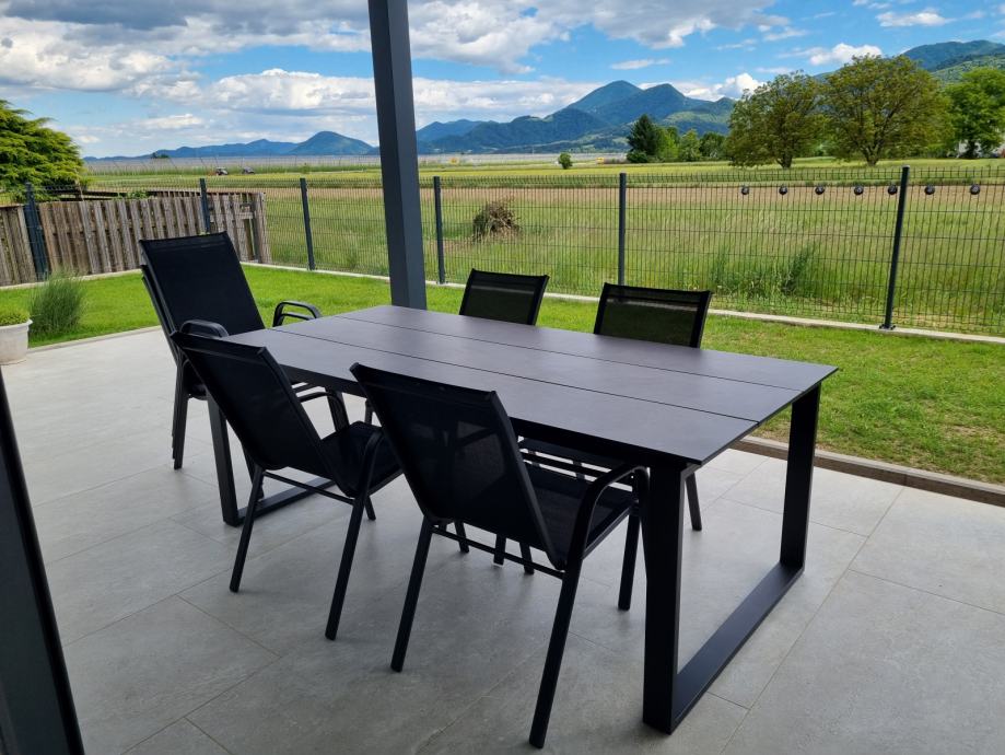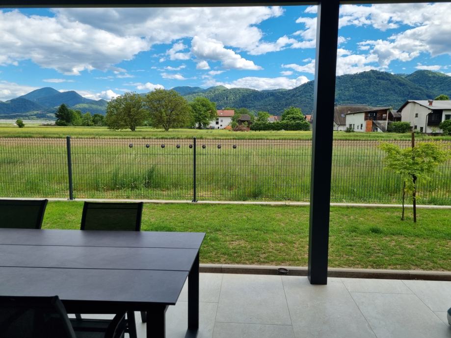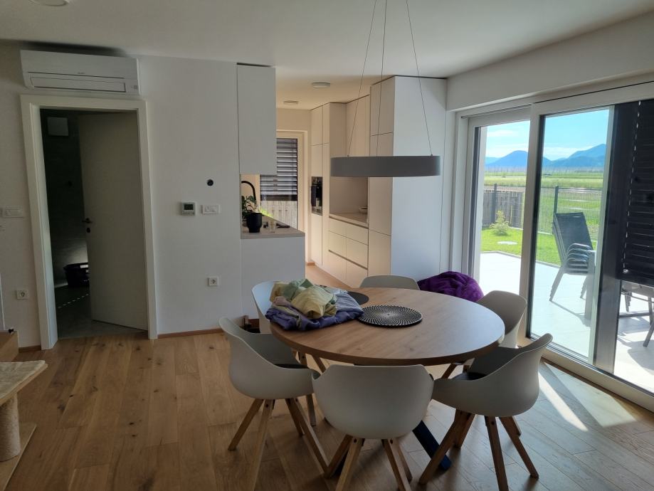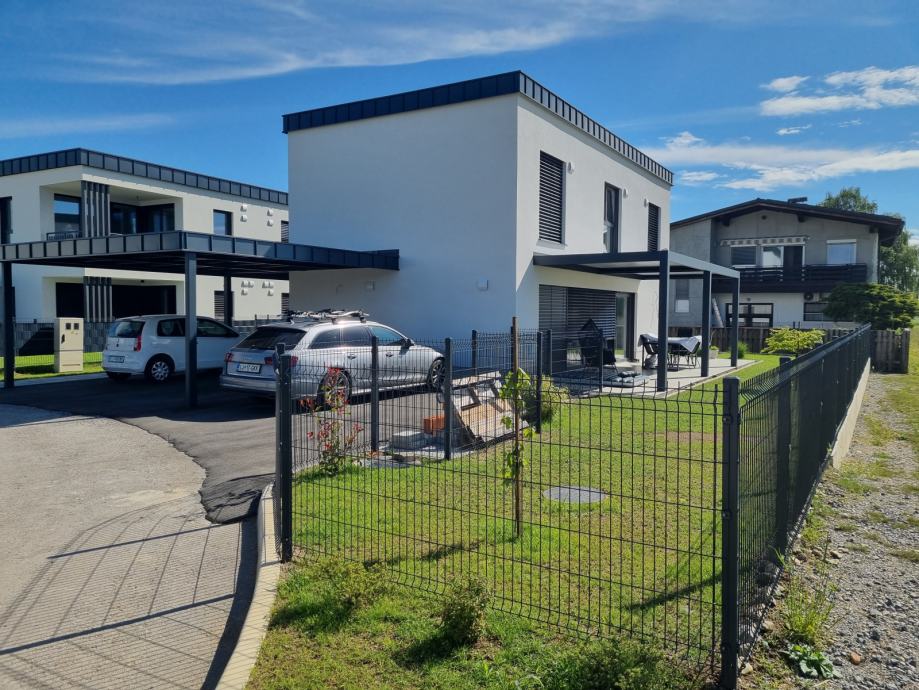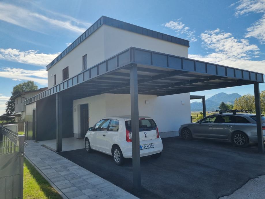 Sodobno zasnovana hiša z ravno streho in velikimi steklenimi površinami, dvojna bioklimatska pergola izmer 8X3 m, velika terasa 36 m2, 1 minuta vožnje z avtom do priključka na avtocesto, hiša je bila v času nabave s primerljivimi hišami v bližnji okolici cca 40.000,00 EUR dražja. Razlog je lokacija in veliko steklenih površin. Pomembno: nepoplavno območje