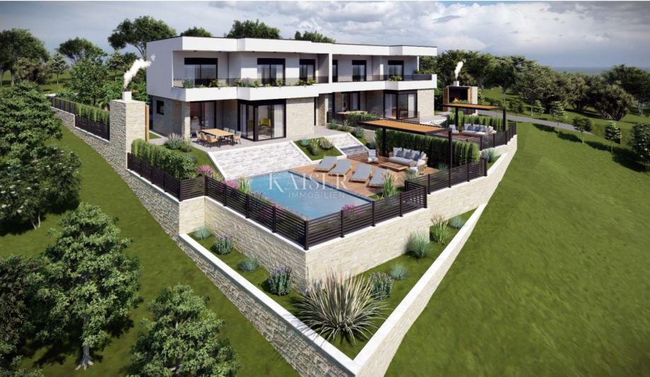 Kaiser Immobilien predstavlja zazidljivo zemljišče velikosti 1290 m2 z dovoljenjem za gradnjo dveh vil z bazenom. Nahaja se na atraktivni lokaciji s pogledom na morje in le 200 metrov od plaže. Prva vila ima skupno 291,22 m2 neto bivalne površine in zunanje površine vključno z bazenom, teraso za sončenje, pokrito in nepokrito teraso. Sestavljen je iz štirih spalnic, vsaka s svojo kopalnico, kleti, pralnice, strojnice bazena, savne, kuhinje in jedilnice. Druga vila ima skupno 274,24 m2 neto bivalne površine in zunanje površine vključno z bazenom, teraso za sončenje, pokrito in nepokrito teraso. Sestavljen je iz štirih spalnic, vsaka s svojo kopalnico, kleti, pralnice, strojnice bazena, savne, kuhinje in jedilnice. Vila je zasnovana tako, da izpolnjuje največ 5 zvezdic pri kategorizaciji počitniške hiše. Oddaljenost lokacije od priključka na avtocesto = 16 km Oddaljenost lokacije od letališča Zadar = 35 km Oddaljenost lokacije od centra Paga = 25 km Oddaljenost lokacije od plaže Zrče = 48 km Oddaljenost lokacije od Nacionalni park Paklenica = 35 km Oddaljenost lokacije od centra Zadra = 28 km Agencijska provizija za kupca je 3% + DDV. Za več informacij nas kontaktirajte na +385992140008 ali na e-naslov: dean@kaiser-immobilien.hr.