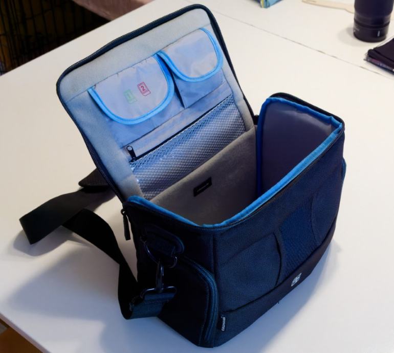 - udoben nahrbtnik s stranskim dostopom do fotoaparata, mehkim pasom, da nosimo opremo na bokih, zato zelo primeren za prenašanje večje opreme