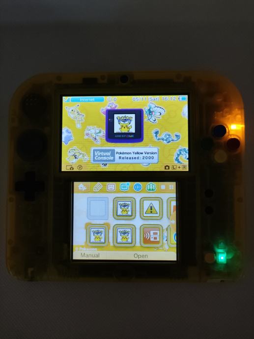 Prednameščena igra Pokemon Yellow ki jo je možno igrati v petih različnih jezikih. Koda za temo Pokemon Yellow je uporabljena in je že naložena na 2DS. Nalepke nedotaknjene.