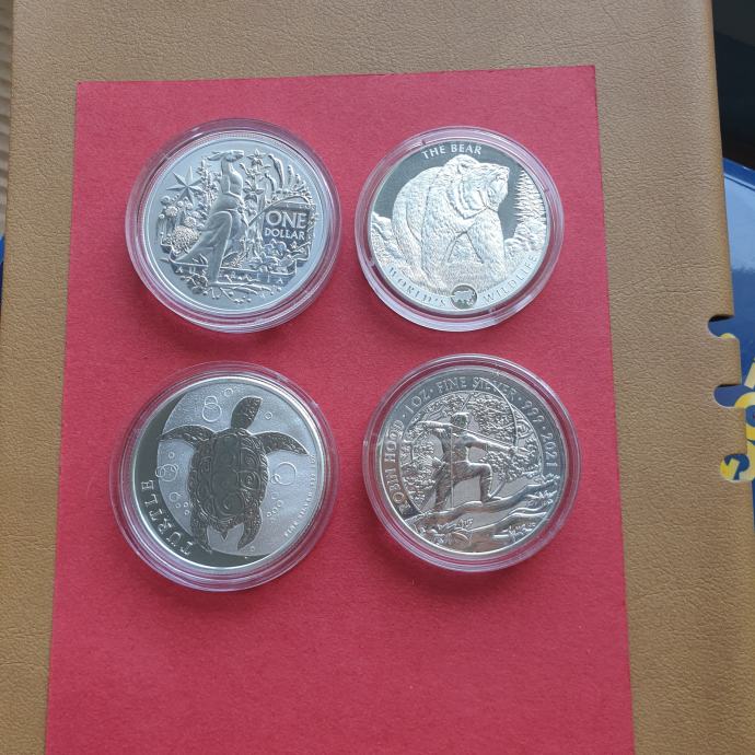Prodam 1 unčne (31,1g) srebrnike. Čistina srebra 999,9. Letniki 2021 in 2022. Vsi so v kapsulah in lepo ohranjeni. Cena za prvega 37€, za 2 in 4 je 36€- želva(3) prodana. . Pošljem po pošti-poštnina 3,20€ ali pa osebni prevzem v Ljubljani. Oglejte si še ostale moje oglase s kovanci.