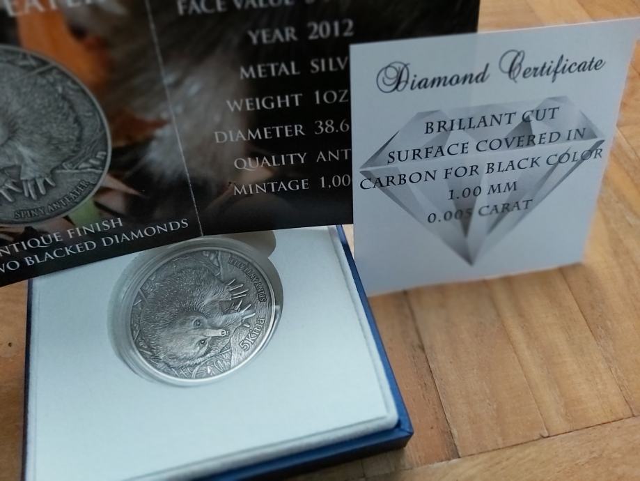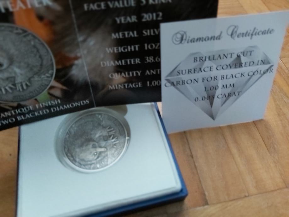 Lično vstavljen v pripadajočo škatlico z certifikatom za srebrnik in certifikatom za vstavljena črna diamanta.