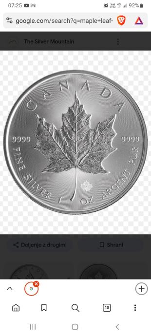 Kanadski Mapel Leaf, z najvišjo čistočo srebra 9999.