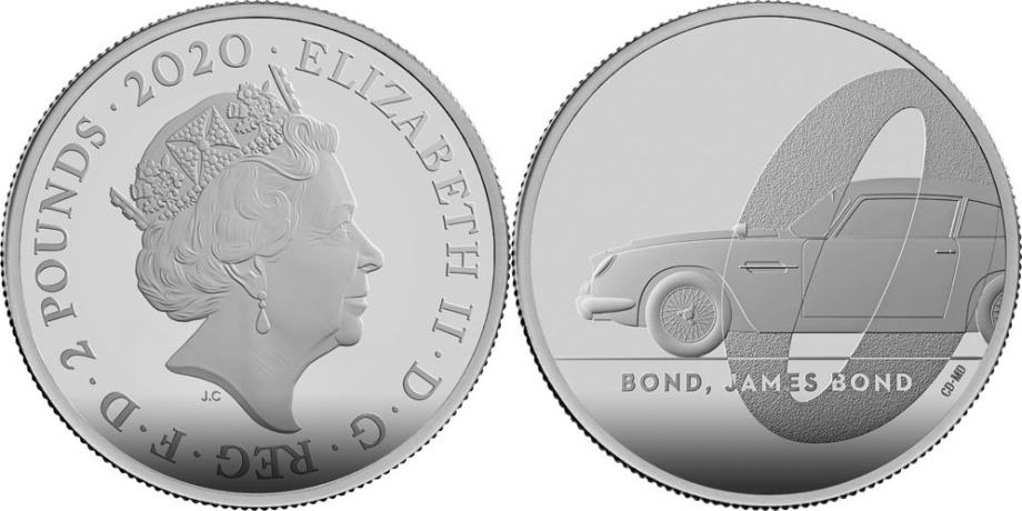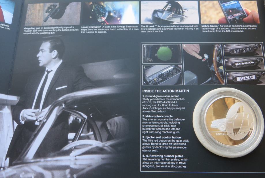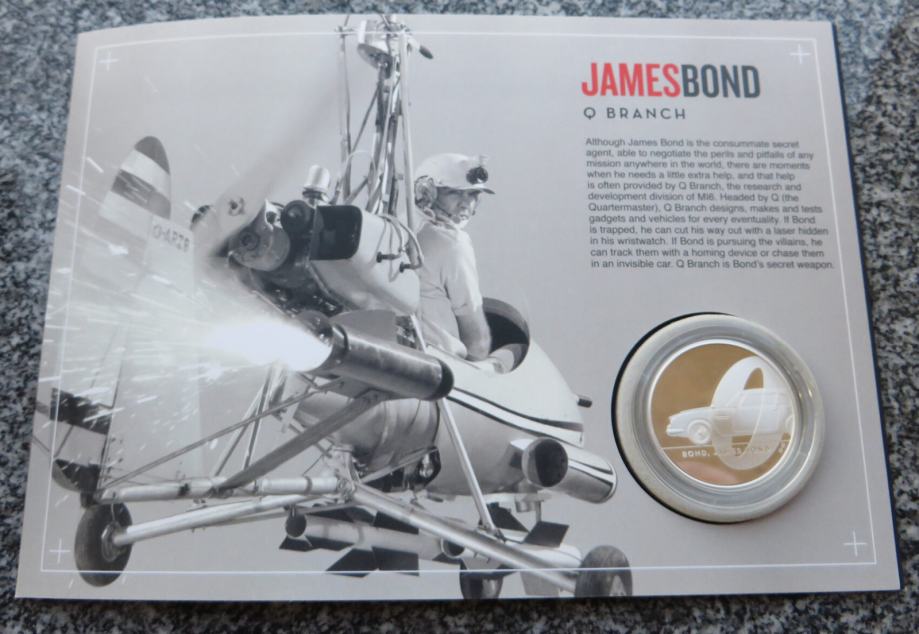 The coin insert explores the world of Q Branch and includes an image of Bond flying the autogyro aircraft, Little Nellie, in You Only Live Twice.