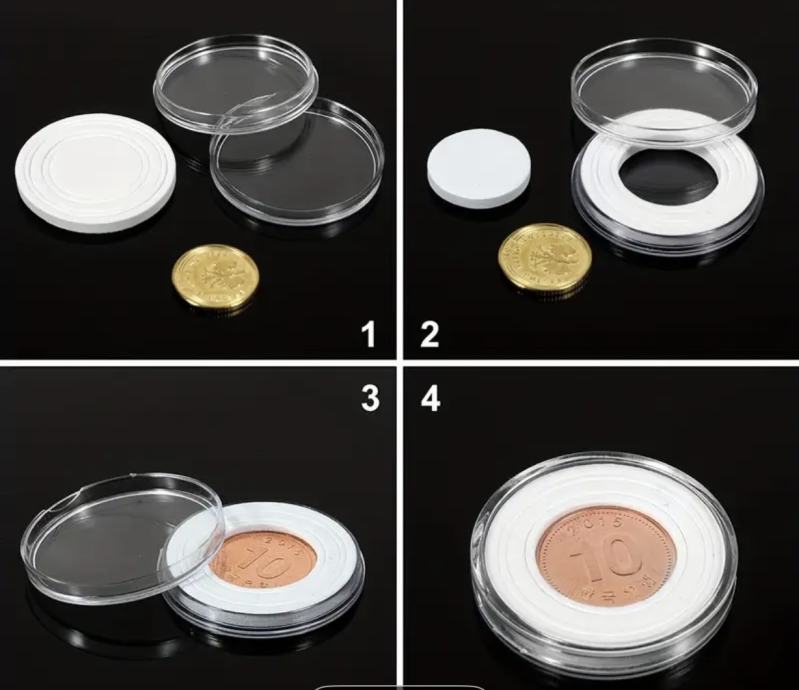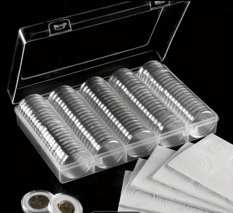 Prodam zaščitne kapsule za kovance. V plastični škatlici je 100 kapsul premera 30 mm, glede na premer kovancev pa se lahko notranji premer kapsule zmanjša s priloženo peno (za lažjo predstavo si oglejte fotografije). Komplet je nov.