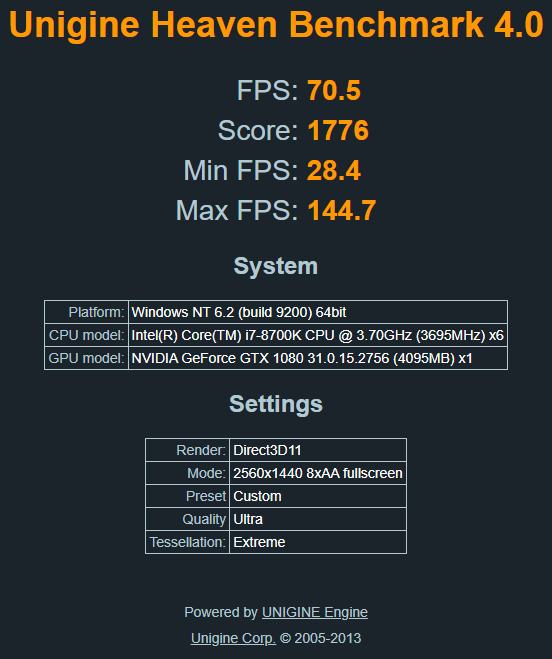 Kartico sem pred objavo oglasa testiral s FurMark, kjer je po 30 minutah na maksimalnih nastavitvah pri 1440p dosegla maksimalno temperaturo 73 stopinj celzija. Testiral sem jo tudi na Heaven Benchmark, rezultati katerega so na ogled med priloženimi slikami.