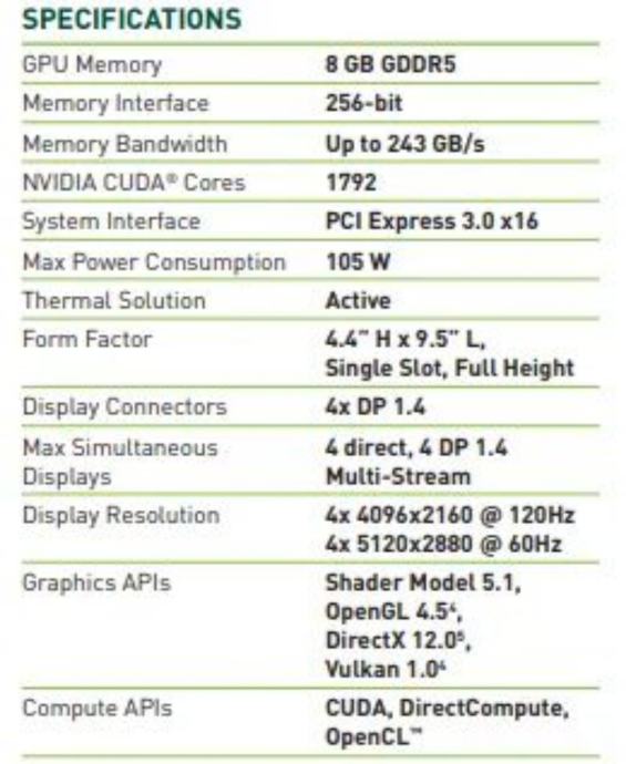 • Združuje grafični procesor Pascal s 1792 jedri CUDA in 8 GB pomnilnika GDDR5 za obvladovanje zahtevnih profesionalnih aplikacij.