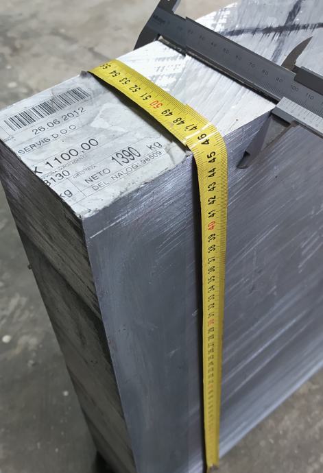Prodam Aluminij ploščo, debeline 100 mm, gabaritov 335 x 450 mm in 200 x 215 mm. Zlitina AlMg3 (5754), proizvajalec Impol