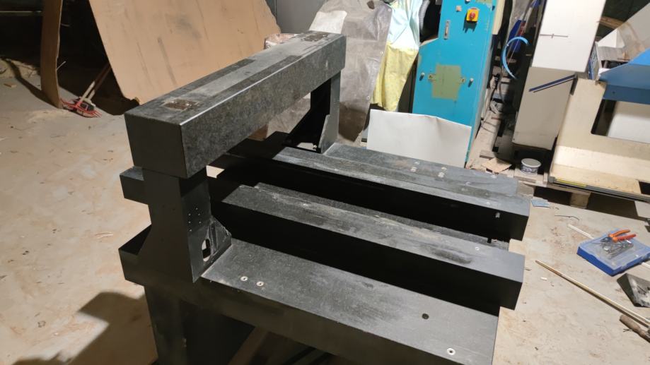 Naprodaj je osnova za CNC. Obseg dobave je viden na sliki, stroj je sestavljen iz precizno brušenih granitnih plošč. Na stroj je potrebno privijačiti linearna vodila (v granit se zvrtajo luknje in z epoxy zalepijo navojni vložki). Stroj je zelo tog in masiven, teža je cca 600kg in dimenzijami 1300x1000mm. Širina mostu je 1000mm, dolžina spodnjih granitnih "vodil" na mizi pa je 1300mm. Možnost nalaganja z viličarjem in dostave po dogovoru. Vretena, ki so na sliki niso všteta v ceno. Več info na 031898334.