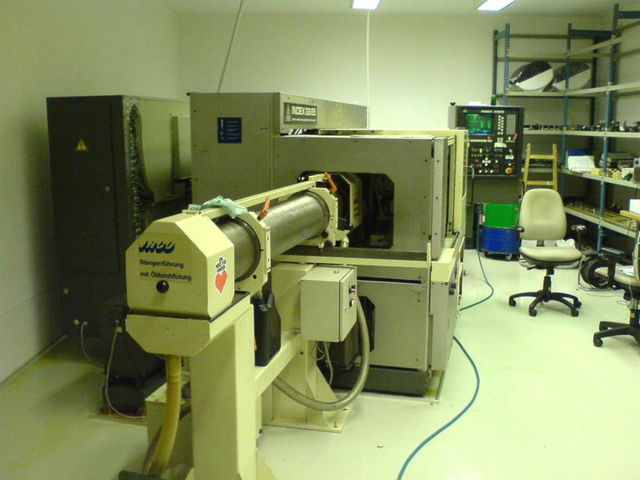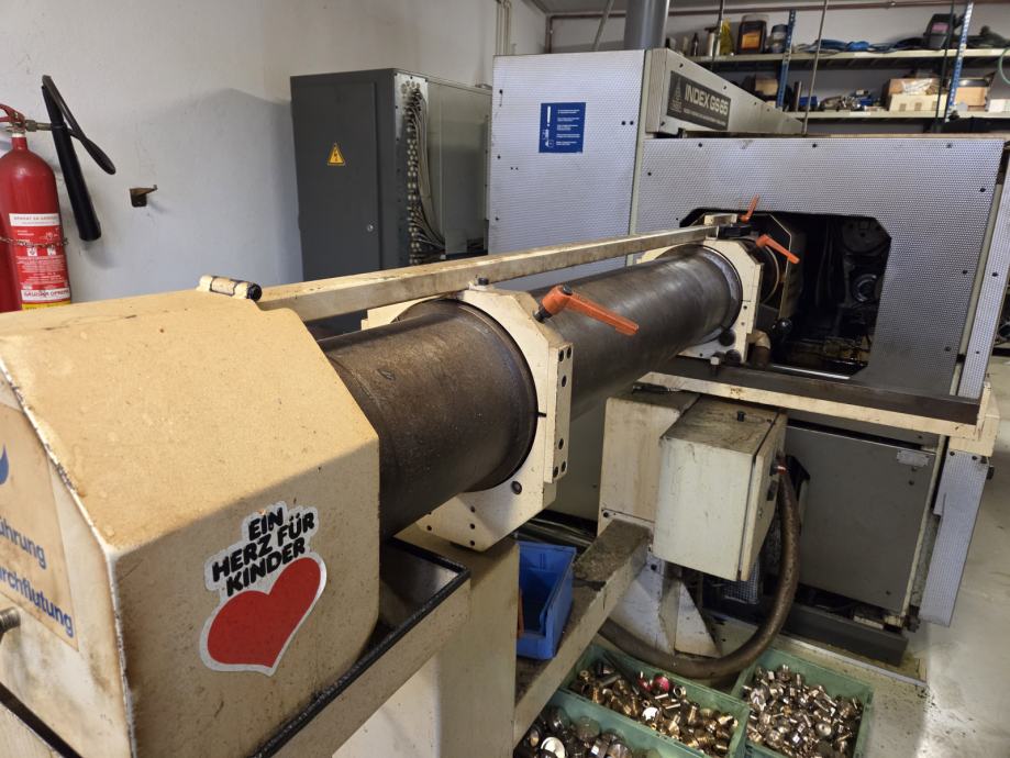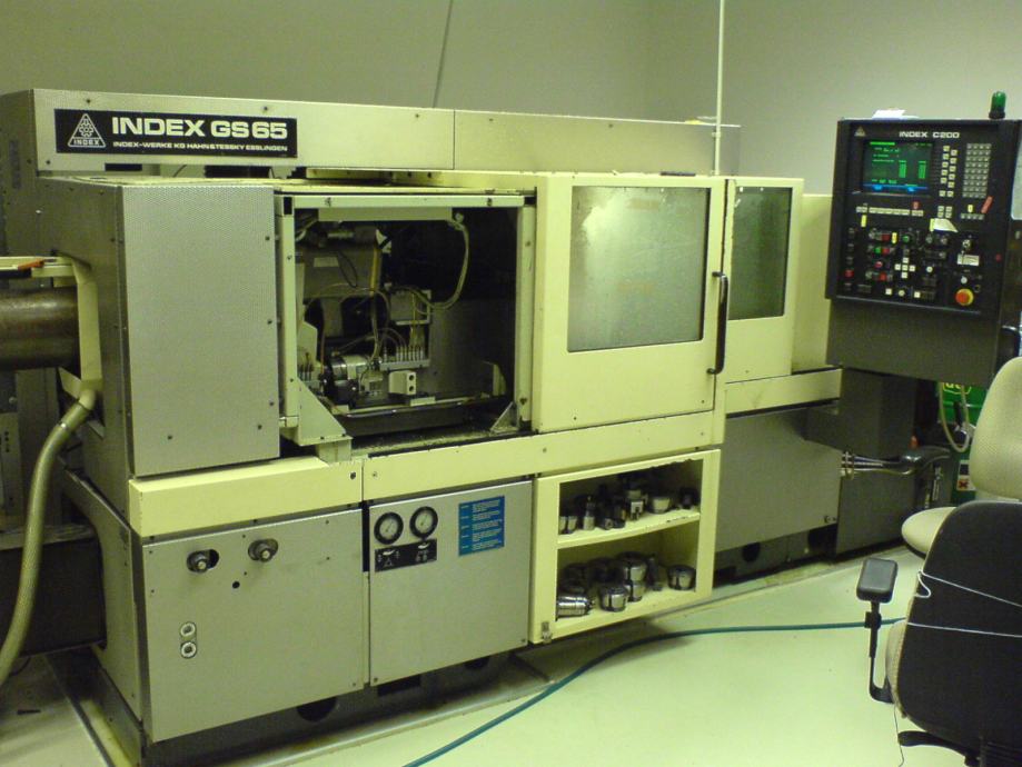INDEX GS65 CNC stružnico prodam. Ima podajalni sistem IRCO za vodenje 3m dolge palice v olju do fi 54. Palico fi 65 dolžine 1m se vpenja direktno v glavno vreteno. Glavno vreteno ima Hainbuch BZI stročnice do fi 65. Nasprotno vreteno ima sinhronsko tri čeljustno amerikansko glavo fi 110 na Revolverju 1. Oba revolverja 1 in 2 imata gnana orodja. Revolver 3 zadaj ima 3 gnana orodja. Krmilje je Index C200 – digitalni monitor je nov.