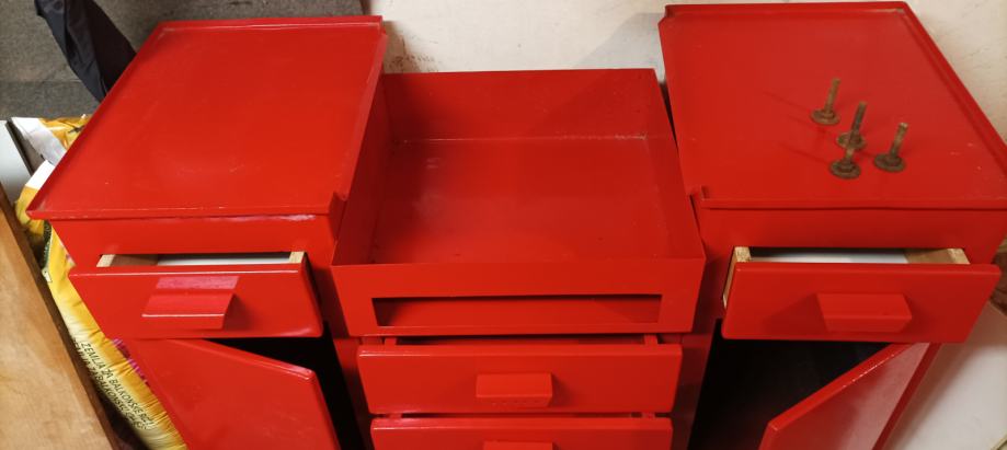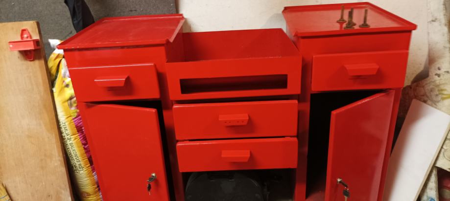 Nova kovinska miza za stružnico ali za drug obdelovalni stroj.Miza je zarardi robustnosti stabilna, štirje predali in dve omarici in lovilec ostružkov.