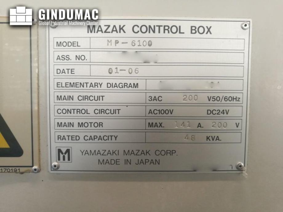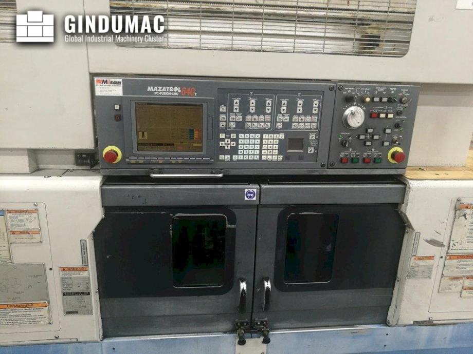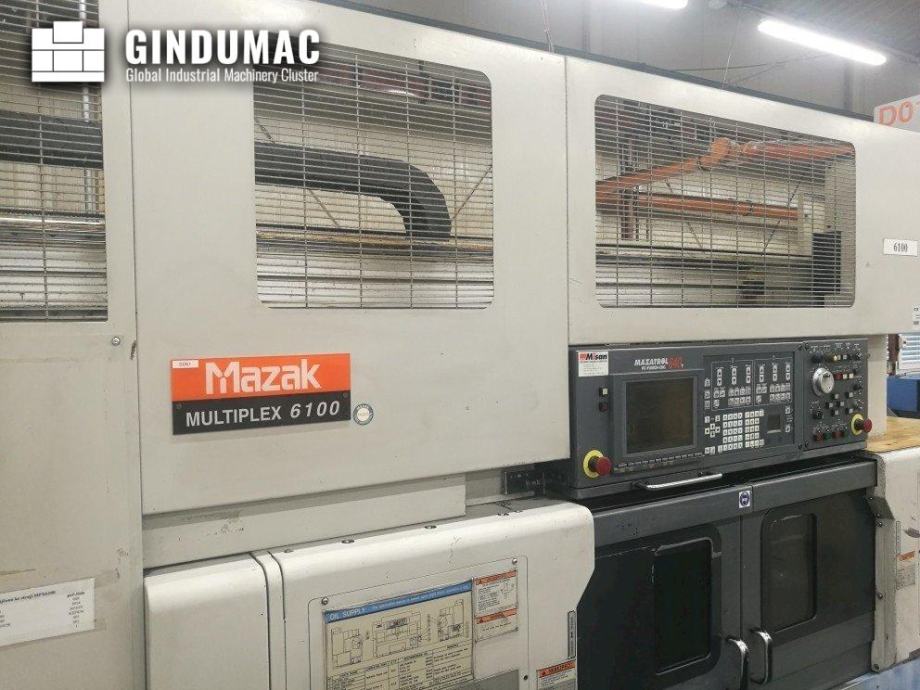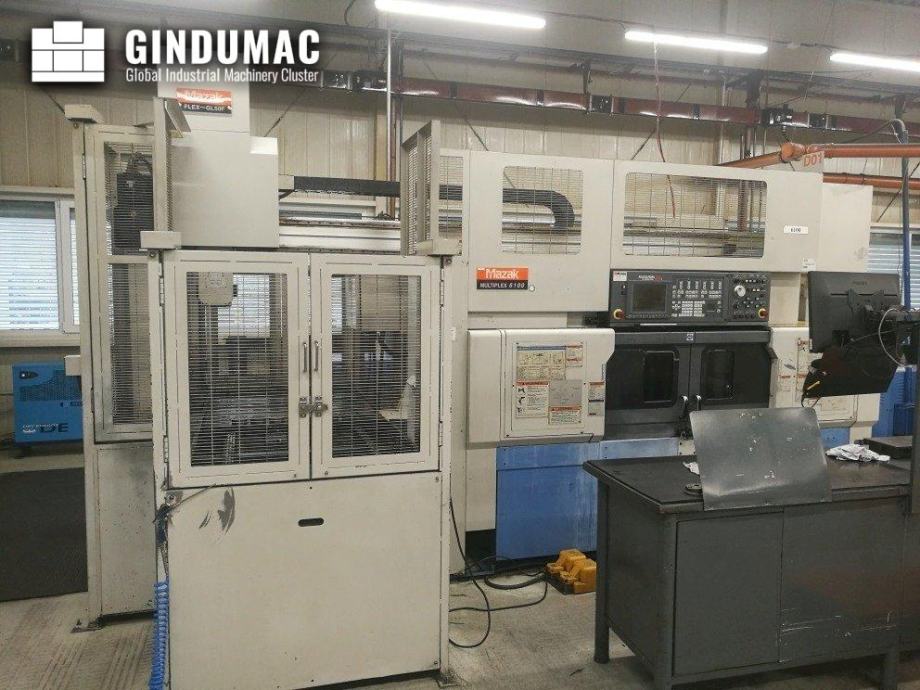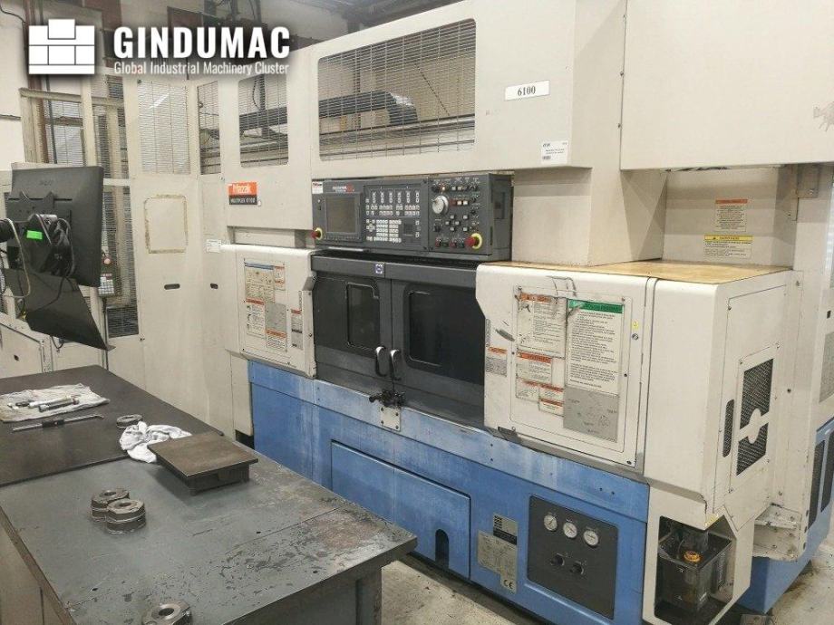 This MAZAK Multiplex 6100 + robot FLEX-GL50F Lathe was manufactured in the year 2001 in Japan. It is equipped with a Mazak Mazatrol 640T control unit and has 3 axis. The machine has a spindle speed of 6000 rpm, is in good condition and well maintained.