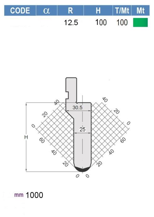Nož, L=1000 mm, uporabljen v dobrem stanju. Višina 100 mm, polmer 12,5 mm, največ 100 T/m. Primerno za Euro / Amada / Promecam / Schiavi upogibne stroje. Za pločevino od 1 mm.