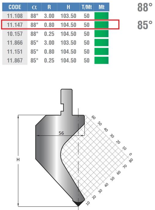 Abkant stiskalni nož z oznako TS.11.147, L = 835 mm x2 kosa, L= 300 mm x1 kos, primeren za upogibne škatle, uporabljeni v odličnem stanju. Višina 104,5 mm, kot 88 stopinj, polmer 0,8 mm, največ 50 T/m. Primež Euro / Amada / Promecam / Schiavi.