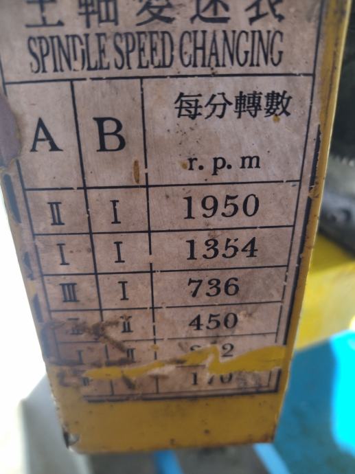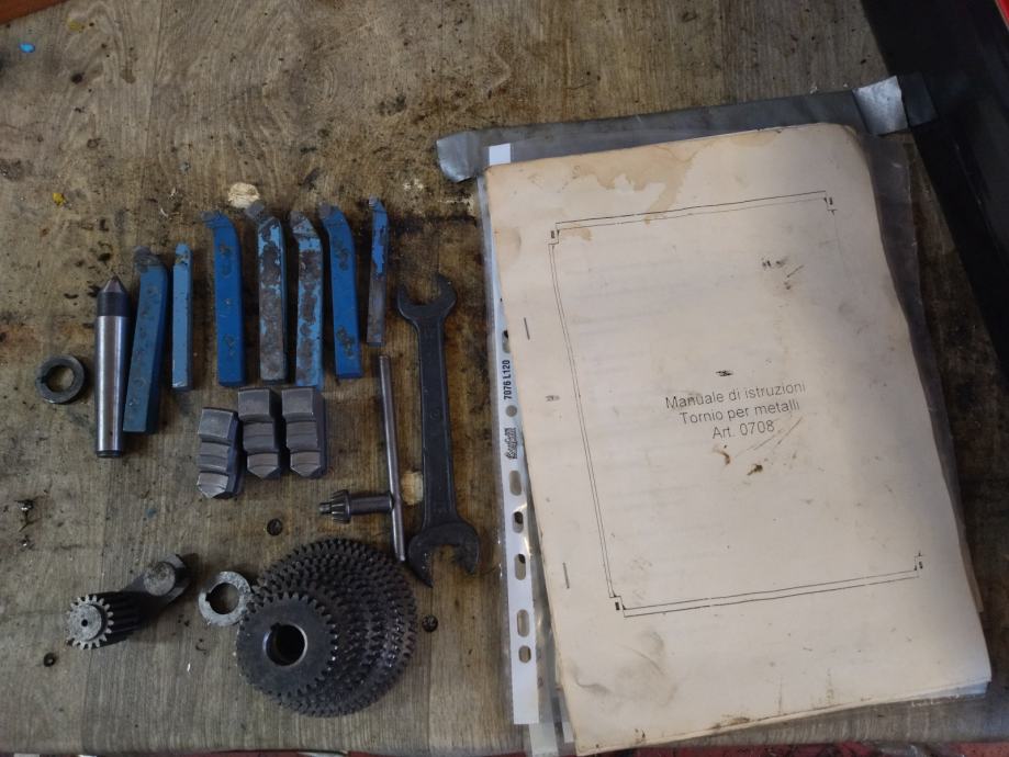 Zraven pride nekaj orodja, kovinski podstavek (visok 89cm, globok 50cm, širok 110cm), navodila za uporabo, tabele za pomike.