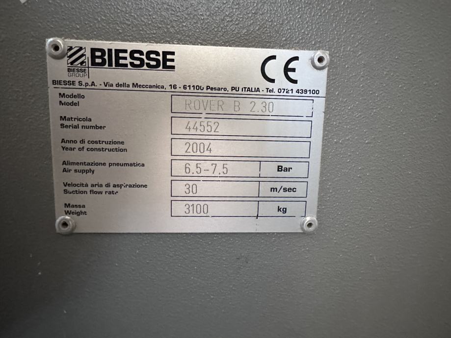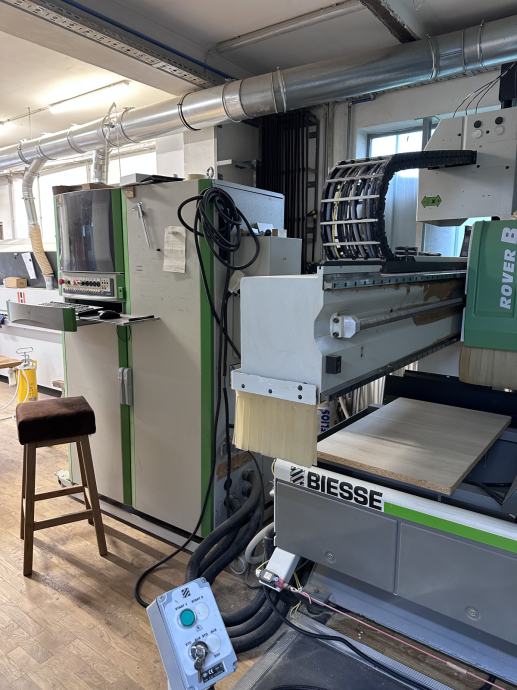 Shramba za 10 orodij ISO 30. Vakum pumpa 90m3/h. Ima tudi C os za rezkanje z kotno glavo. Biesse Works, uporaba A Cad programa.